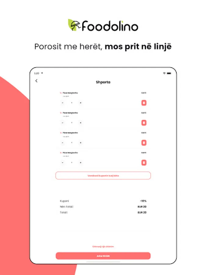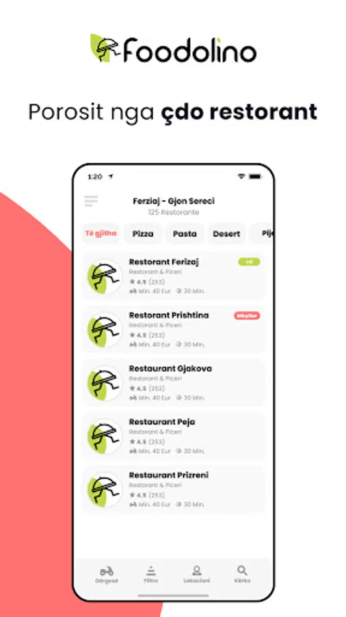 At Foodolino you will not only find delicious burgers, salads or pizzas, but also many other dishes from Kosovo restaurants in your area. Benefit from the large selection, the high quality and the first-class service. No matter if Italian, Asian or Indian; with the Foodolino App you can always order your favorite dish with just a few clicks. Your food will be delivered to your home in less than an hour, free of charge, directly from the kitchen, where you can enjoy it fresh!