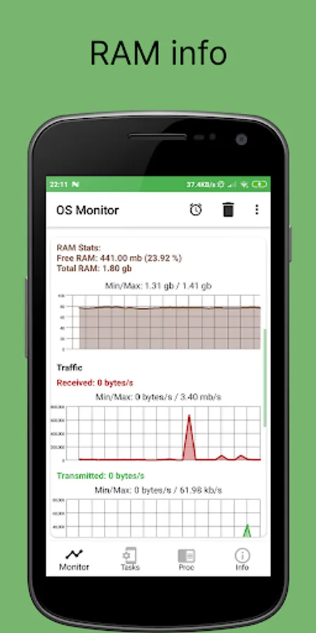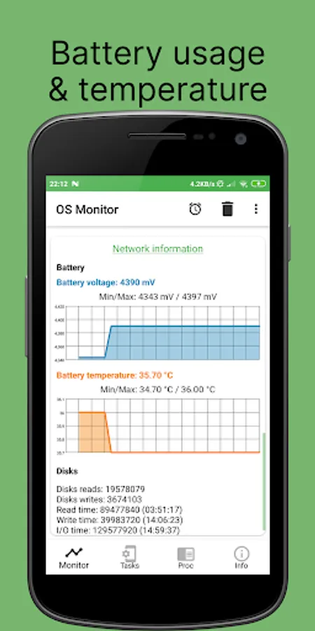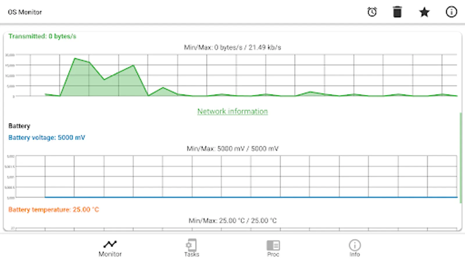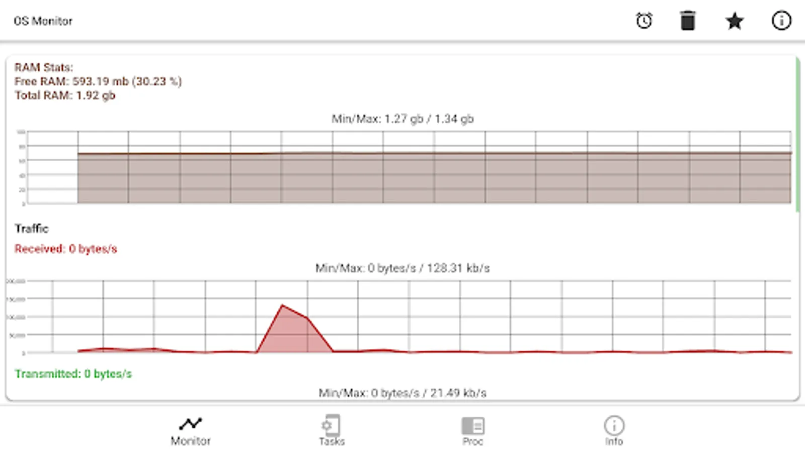 Powerful and simple monitoring app for your Android device. App shows a various system components and resources for example battery, cpu, ram disk usage, net manager. OS Monitor shows the processes, network incoming and outgoing traffic for applications that are running on your Android, so you can check status for system components and see how installed apps affect your device activity and performance.