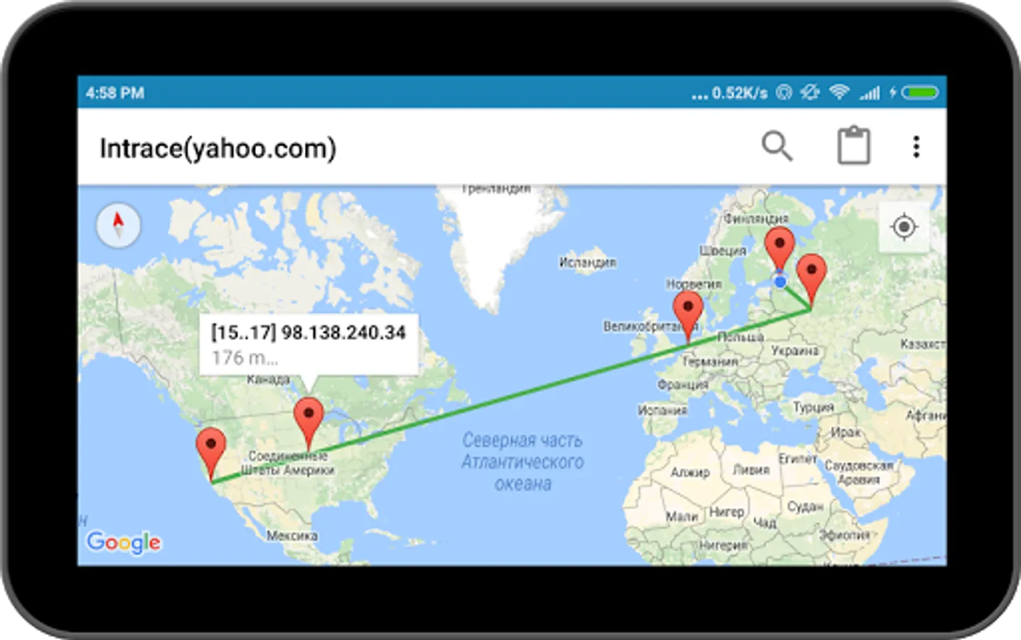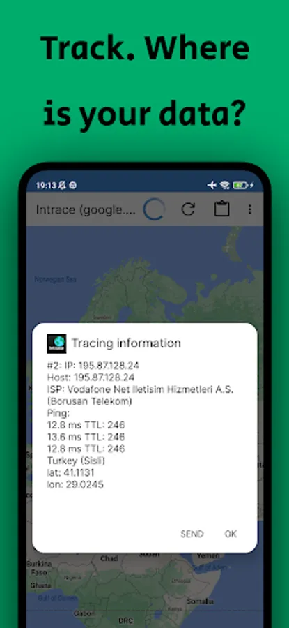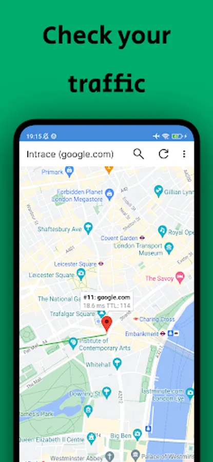 Intrace for Android uses specific "ping" commands, which are usually available on most devices (smartphones, tablets, laptops, PCs, etc.). The application database helps you identify the geographical location of all the way of transmission packet data.