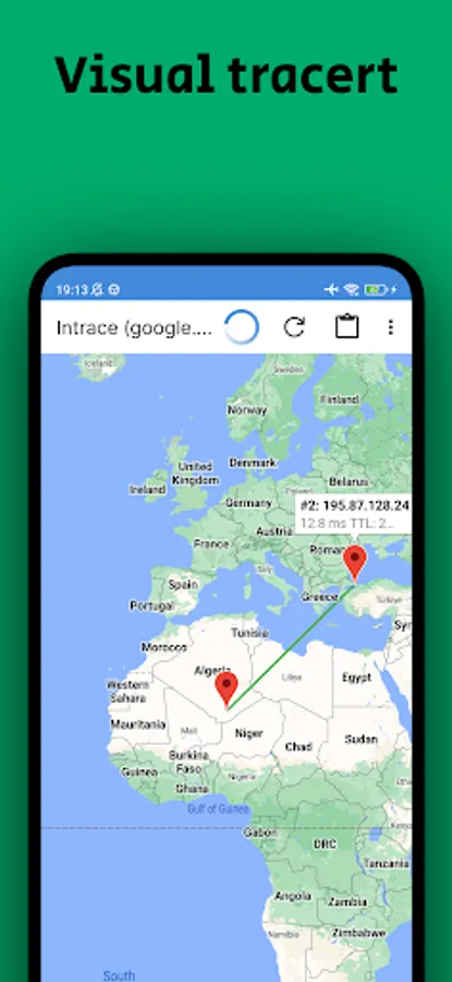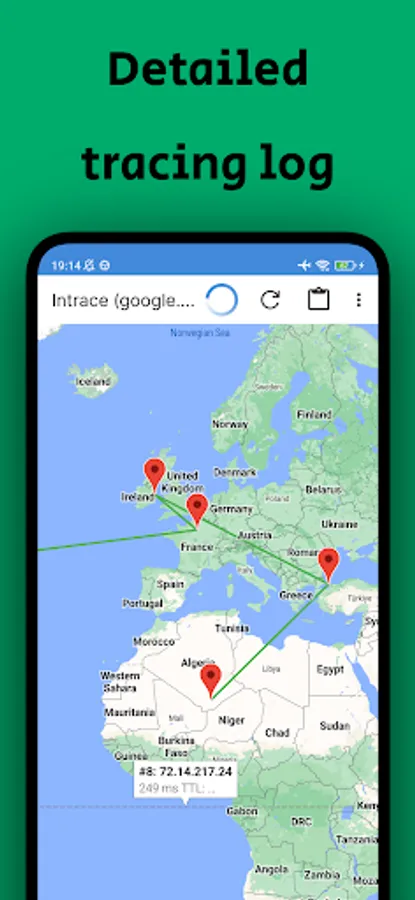 Intrace Visual traceroute for Android is a versatile app, which helps you trace the process of transferring data from your Android device on servers, located around the world. You can know the route of data packets between your device and any Internet server by either entering a website, a domain or its IP directly.