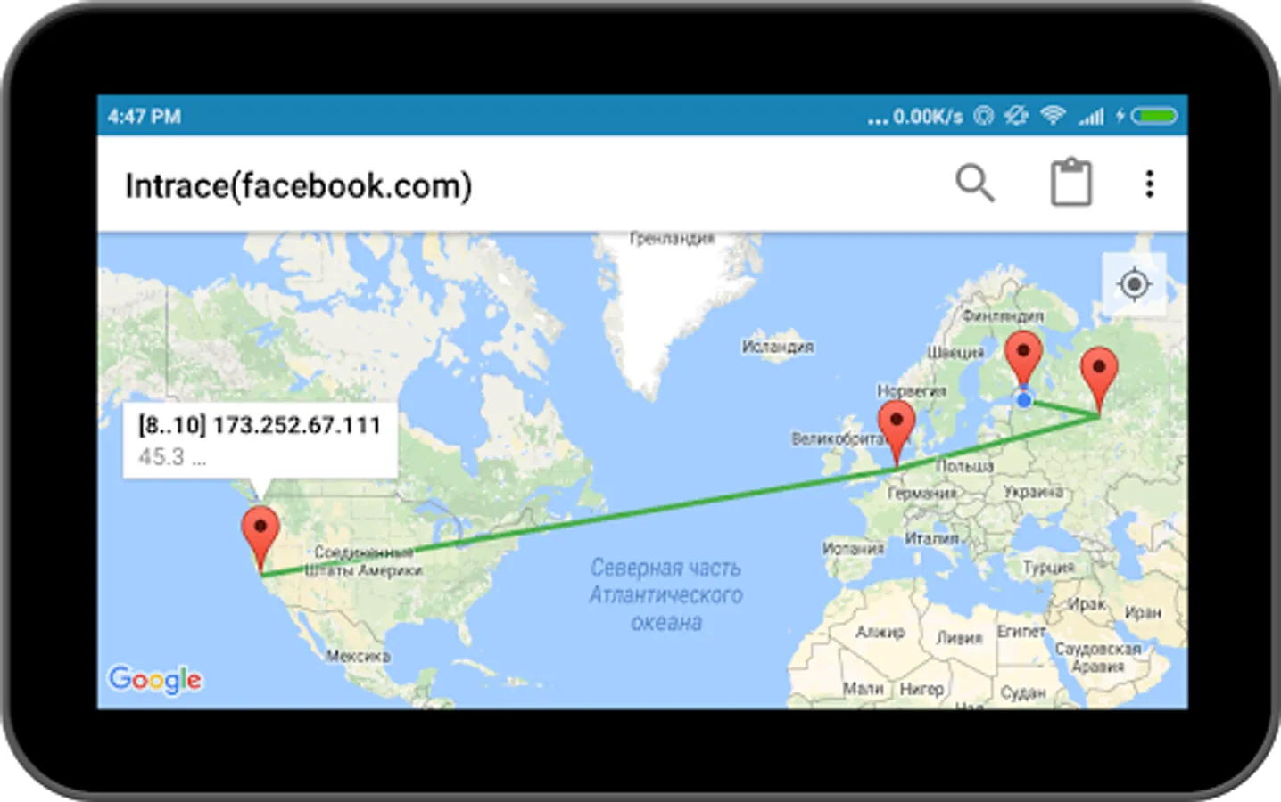 Visual traceroute makes it easy to identify any data route. This network utility provides information about the computers and servers, through which your data is passed. Visual traceroute for Android not only shows the way, but also demonstrates the process of passing on the map. In other words, Intrace for Android shows the addresses of the servers and their location.
