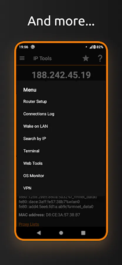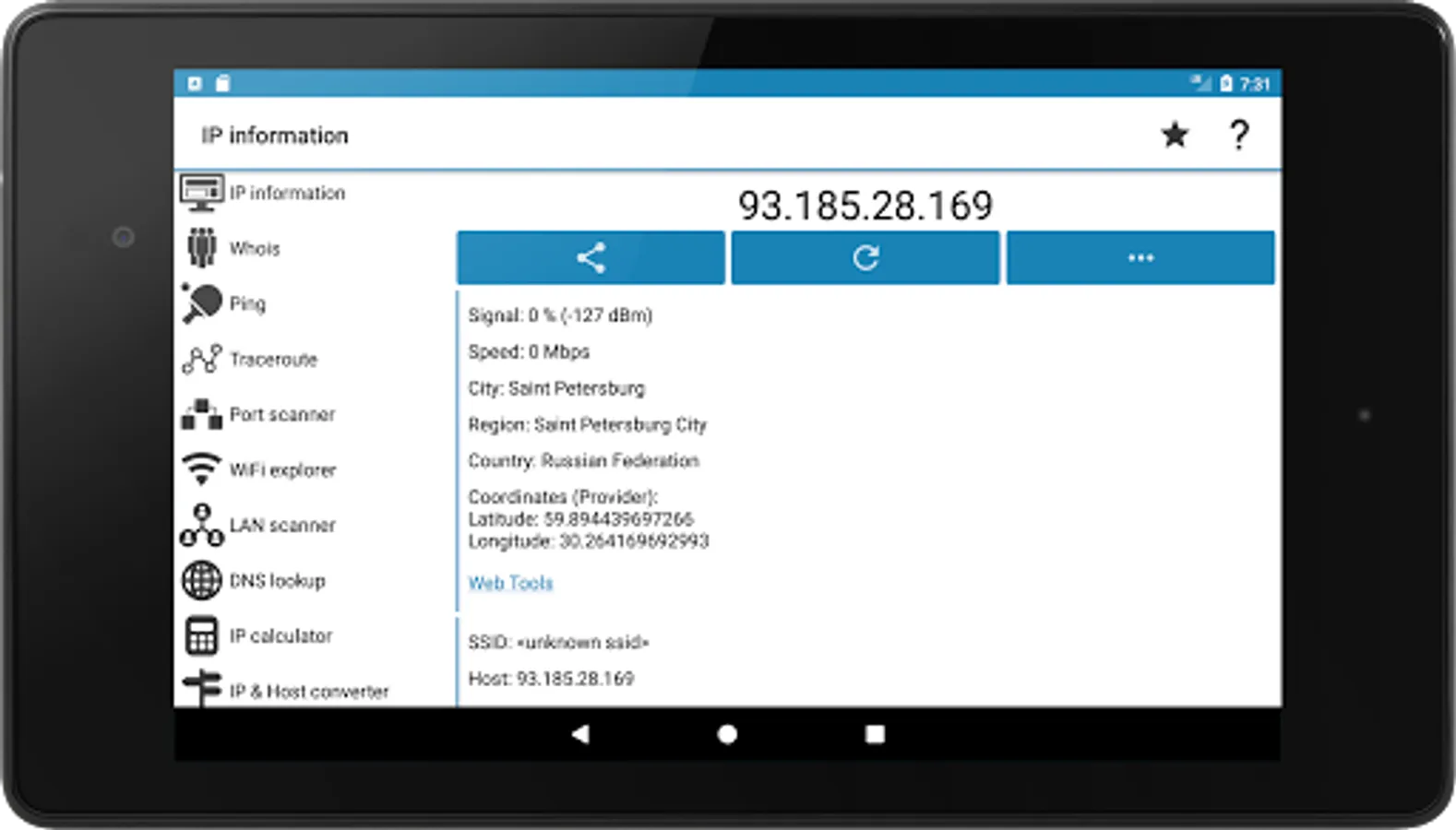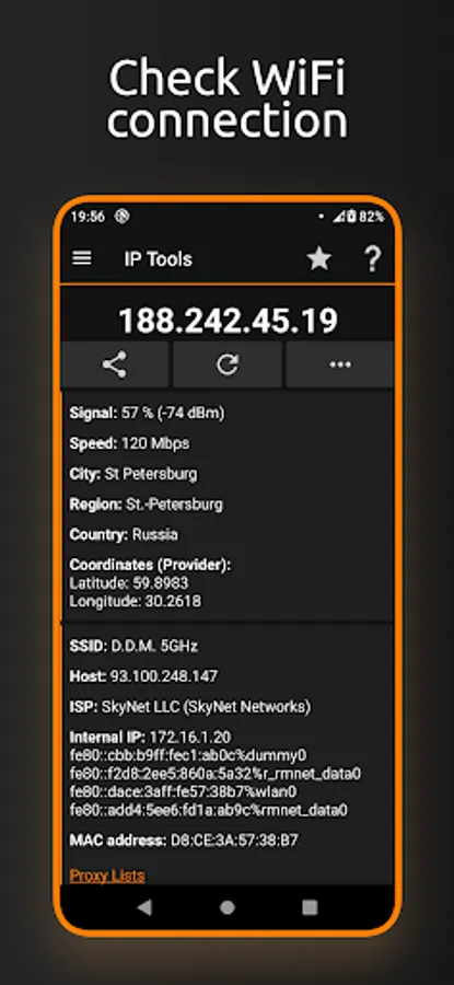 IP Tools has a simple interface, so you can receive within seconds full information about connection, find out local, internal or external address (with my ip), SSID, BSSID, dns, ping time, wifi speed, signal, broadcast address, gateway, mask, country, region, city, isp provider’s geographical coordinates (latitude and longitude), whois, netstat and other basic information.