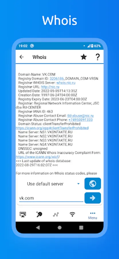 WiFi Tools has a simple interface, so you can receive within seconds full information about your network, find out local, internal or external ip address, SSID, BSSID, dns, ping time, internet speed, signal, broadcast address, gateway, mask, country, region, city, isp provider’s geographical coordinates (latitude and longitude), whois, netstat and other basic information.