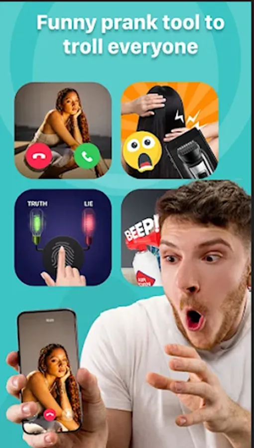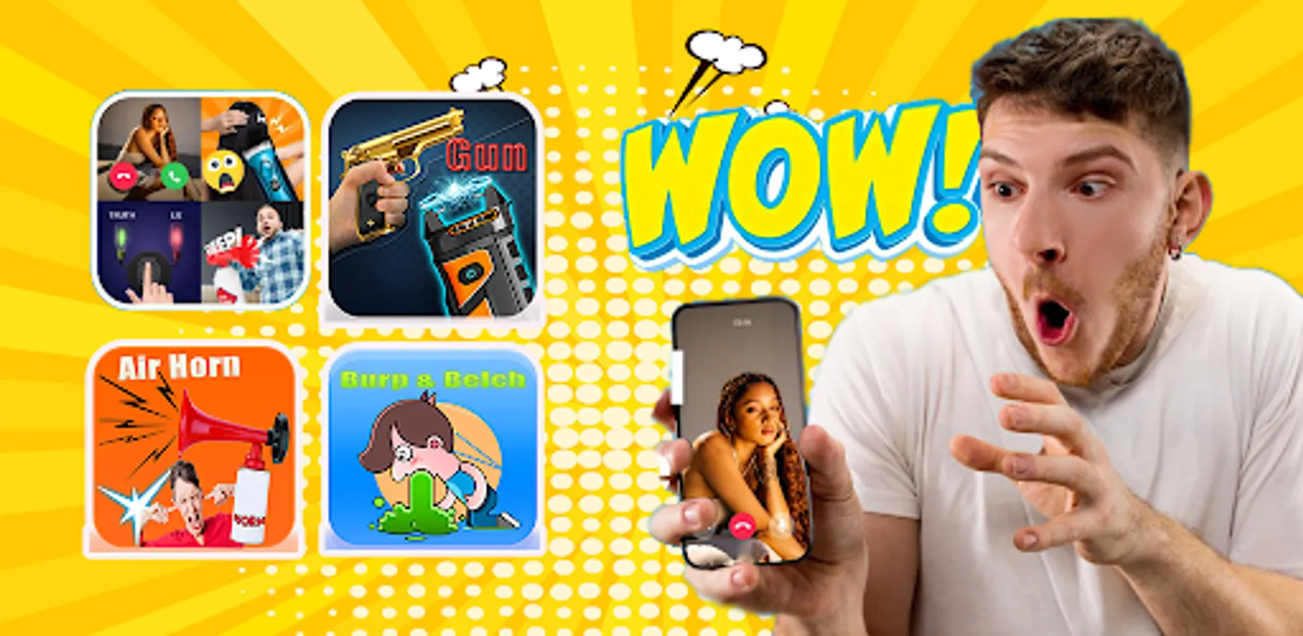 Prank Games - Noise Maker is an all-in-one prank sound and simulator app. It offers various categories of pranks, including fart sounds, air horns, haircut pranks, stun gun, scissors, scary pranks, lie detector test, laser pointer, broken screen prank, and fake video call. Our prank apps are helpful and fun when you want to prank your friends, scare them, wake them up, or cheer them on.