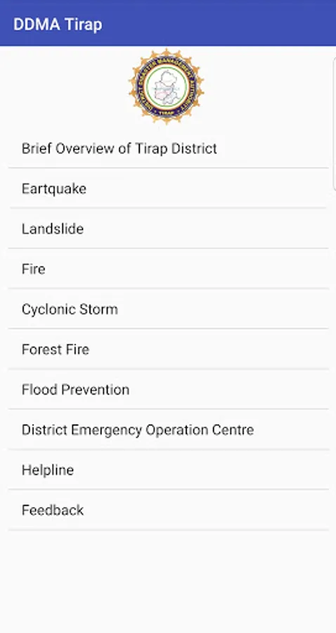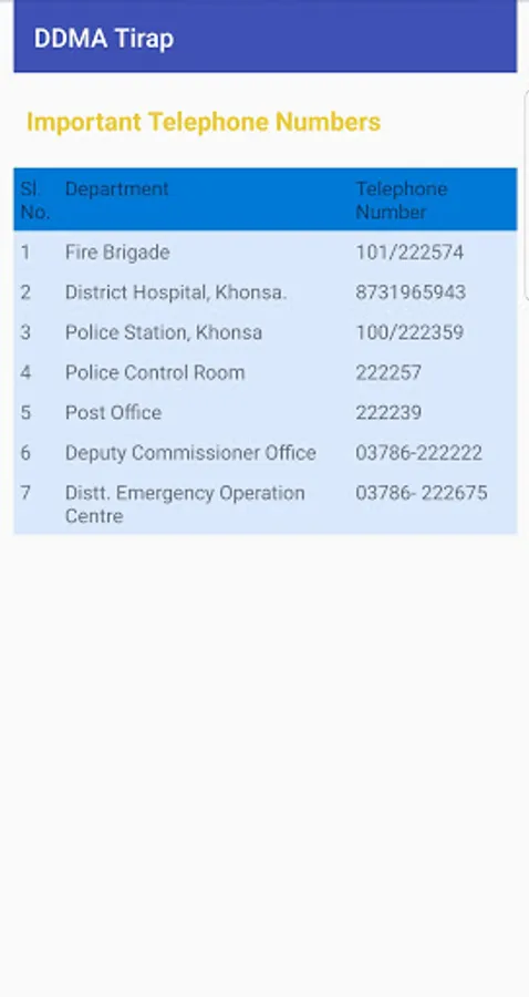 DDMA, Tirap is a static App which contains general guidelines and advisories related to various disaster events and their management in the district. The app also work offline as the data is static.It contain the helpline number of various emergency service of Tirap district .