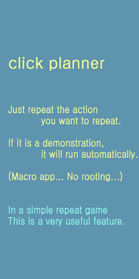 "click planner" is a powerful macro app that automatically repeats a series gesture of click(tap), long click, swipe, and home / back buttons on any screen.