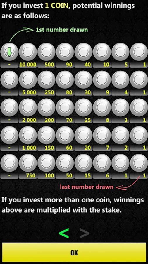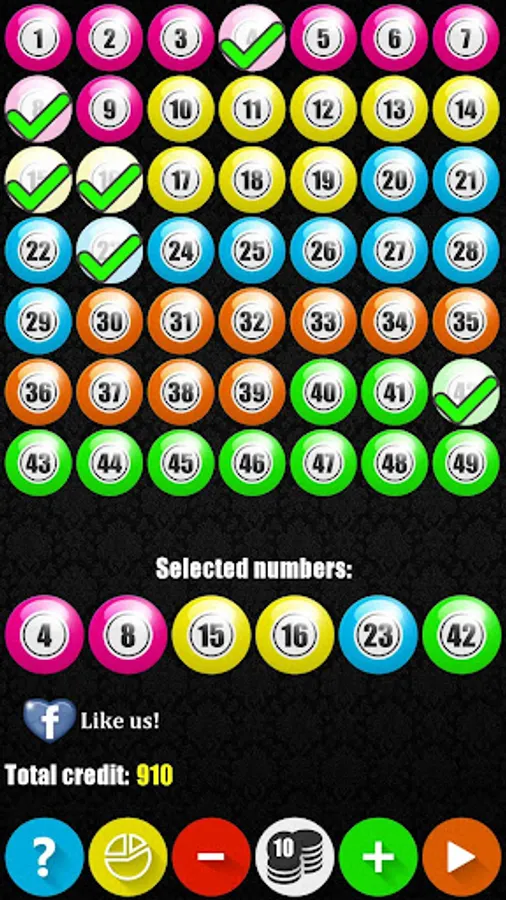 In front of you there are 49 numbers. You may pick any 6 numbers from 1 to 49 by pressing balls on the screen. If you want to discard the selected number, press the ball once again. Select stake (with +/-), press play and enjoy the live draw. The sooner your numbers are drawn, the sooner you'll get more money (as much as it writes next to the 'Max payout').