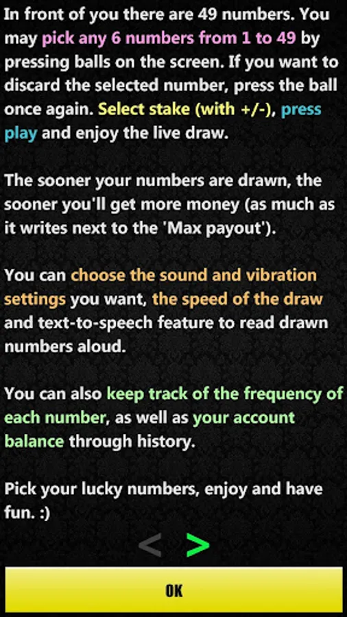 You can choose the sound and vibration settings you want, the speed of the draw and text-to-speech feature to read drawn numbers aloud. You can also keep track of the frequency of each number, as well as your account balance through history.