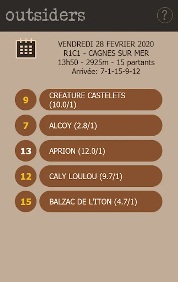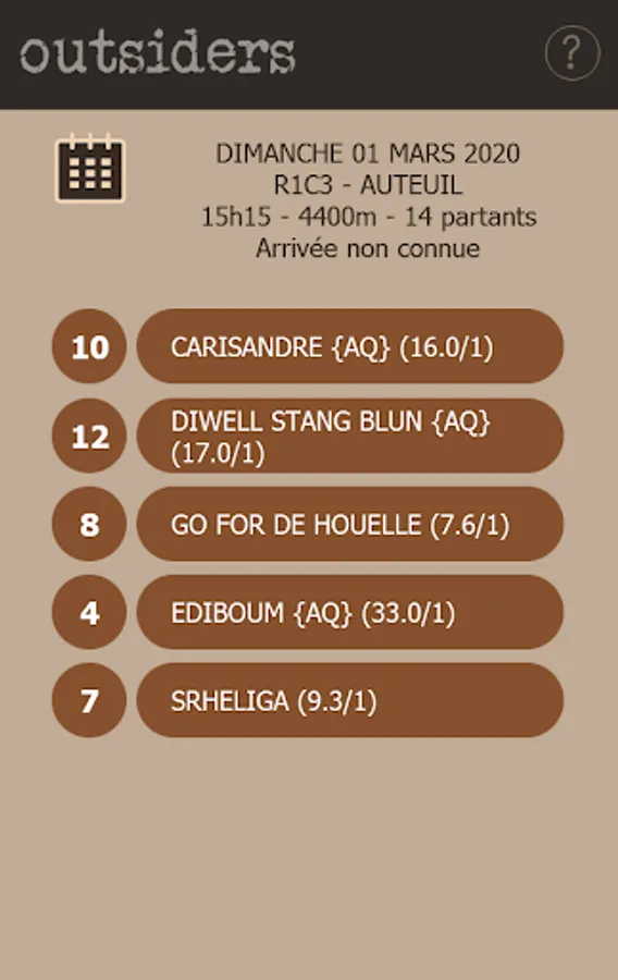Only five horses are extracted from an exceptional calculation measuring the theoretical chance of each horse in competition. Everything is scrutinized, be it the value of the engagement, the performances, the gains, the form of the protagonists and actors of the race, the very conditions of the race, etc. But what best defines the application is the distribution of the selected horses: if it is obvious not to leave out the favorites of the event, "OUTSIDERS" strives to integrate the horses into big odds, which have a potential chance of appearing in terms of their average and general performance, even if their last outings have not really convinced.