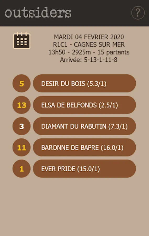 With "OUTSIDERS", five theoretical bases of the race are communicated to you every day from 8:00 am, with the number of the horse, its name, its rating in real time and possibly its origin. These are listed in order of importance.