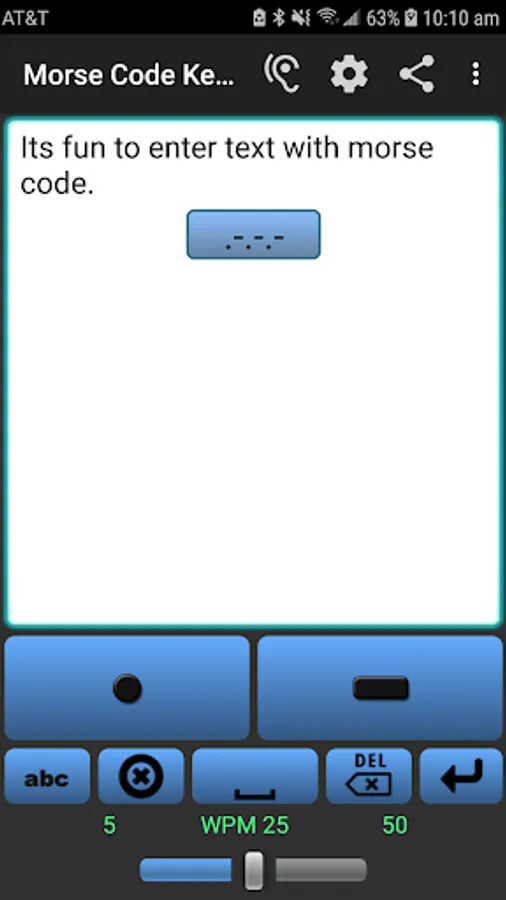 Morse Code Keyer allows text entry from Morse code input. It features a CW paddle type interface with a dit key and a dash key to enter the characters. This is good way to practice generating Morse code. This practice can solidify skills in learning and forming the Morse code characters. This skill can translate directly to sending CW on the ham radio bands if you have an amateur radio license. If you don't have a license, it can be fun to impress your friends with messages you composed with Morse code.