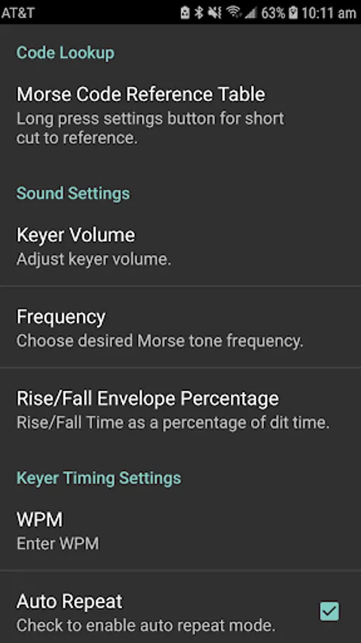 For the keyer you can adjust whether or not the keys should repeat. For example, holding the dah key repeats the dah key at the current WPM setting. Iambic mode is also adjustable. With this on and when both keys are pressed, the dits and dahs will alternate. The auto spacing feature is also adjustable. This adds spaces automatically at word boundaries.