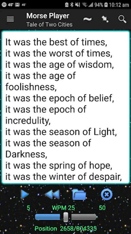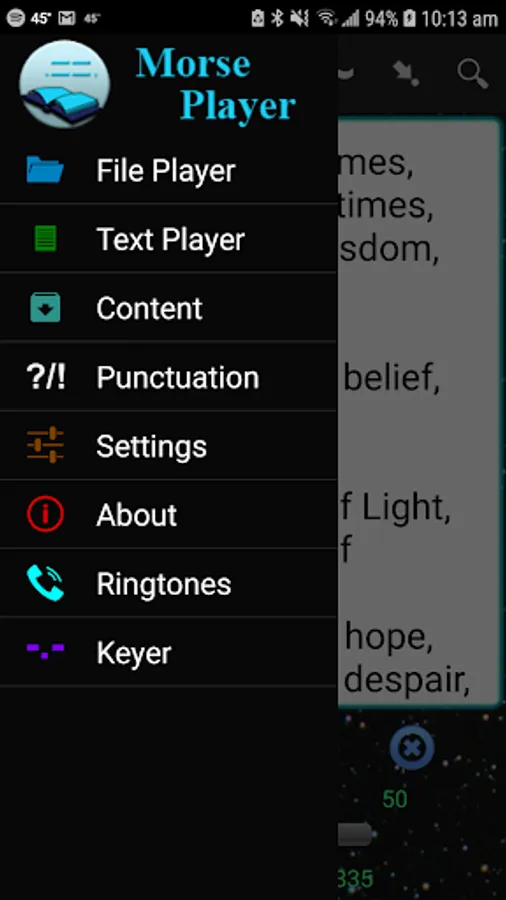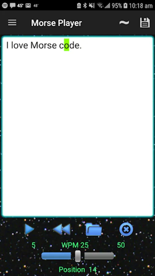 Morse Player will convert text into Morse code (CW) sounds. It has two modes, real time and text file encoding. In real time mode, characters entered from the keyboard will be played as they are typed. In file mode, a file can be loaded and played back as CW. Using Morse Player is a good way to go from knowing the Morse code characters to hearing words. It is not designed to specifically be a trainer, but training files could be generated and used to learn the characters. For example, I’ve created files with ham radio call signs to help in call sign recognition for CW amateur radio contesting. Also, using the real time mode and typing the characters is a good way to learn their sounds. Free public domain books from http://www.gutenberg.org can be downloaded and played as Morse code in Morse Player. Listening to these books in Morse code is a good way to improve conversational CW copying skills. The only file format supported is UTF-8.