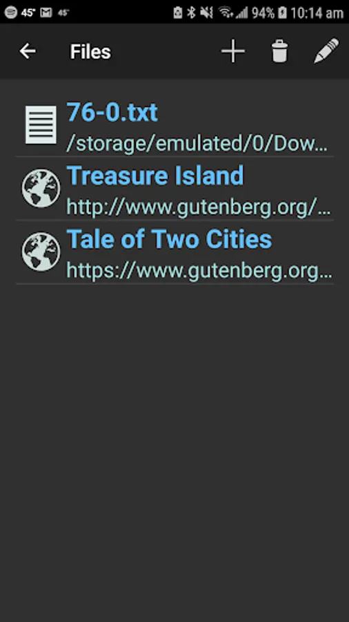 Version 1.0.9 added the Save Text feature. This feature will save the first 1K bytes in the edit buffer to new memory location. The first five memories will be added to the 'Save Text' menu for quick recall and play. The 'Manage' menu selection will navigate to the Save Text activity without adding a memory location.