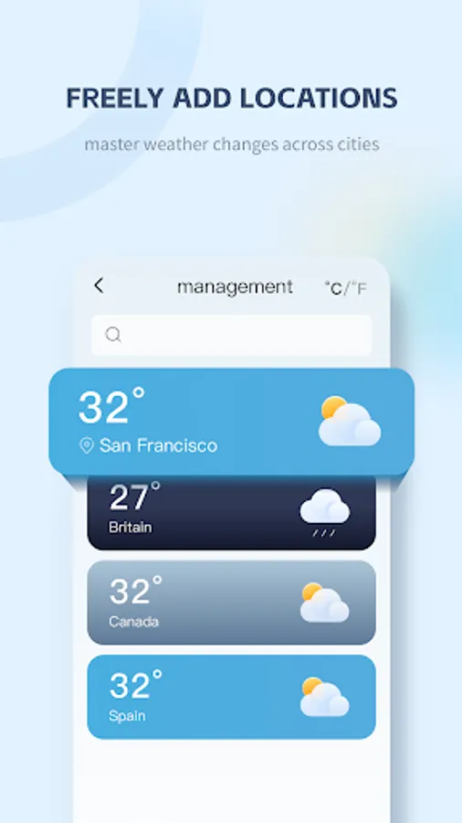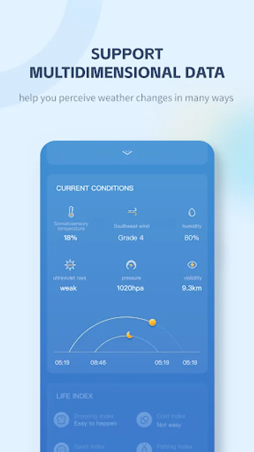 Offer service all-around the world, supporting township-level weather information query. Support 20+ weather detail data such as smog index and scale of wind force.