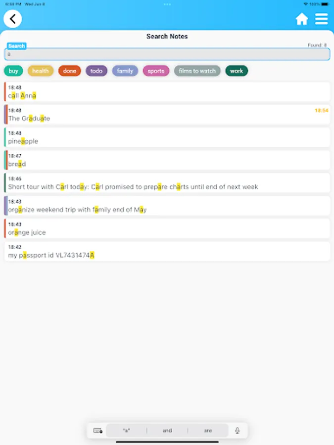 VIA Journal Pro is designed to store and manage notes of any kind. Define tags like "Family", "Work", "Birthdays", "To do", "Shopping", "Books", "Movies" etc. and assign tags to the notes for quick reference later when you they need.