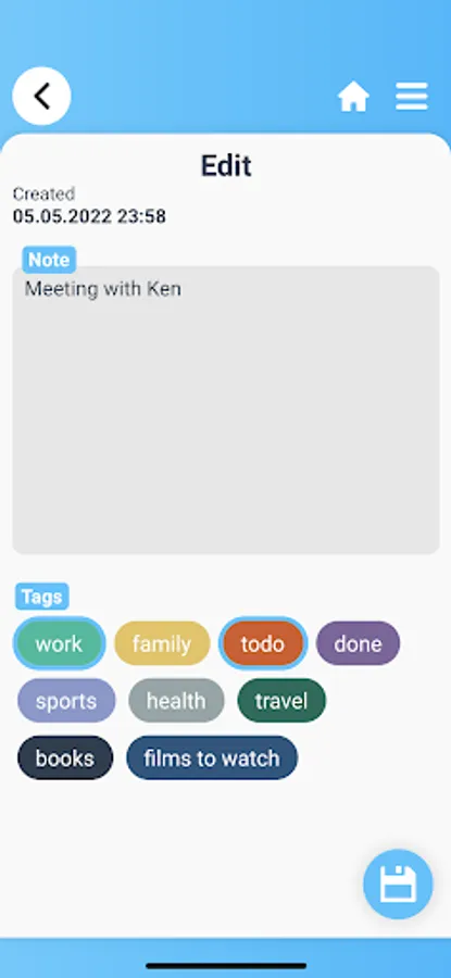 VIA Journal is designed to store and manage notes of any kind. Define tags like "Family", "Work", "Birthdays", "To do", "Shopping", "Books", "Movies" etc. and assign tags to the notes for quick reference later when you they need.