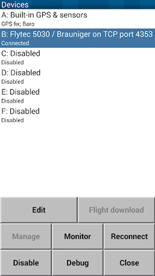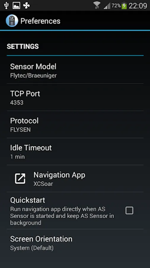 Before using AS Sensor you should be familiar with the navigation app and configure the related driver and TCP server port, see screenshots. AS Sensor uses the Flytec FLYSEN or BRSF protocol.