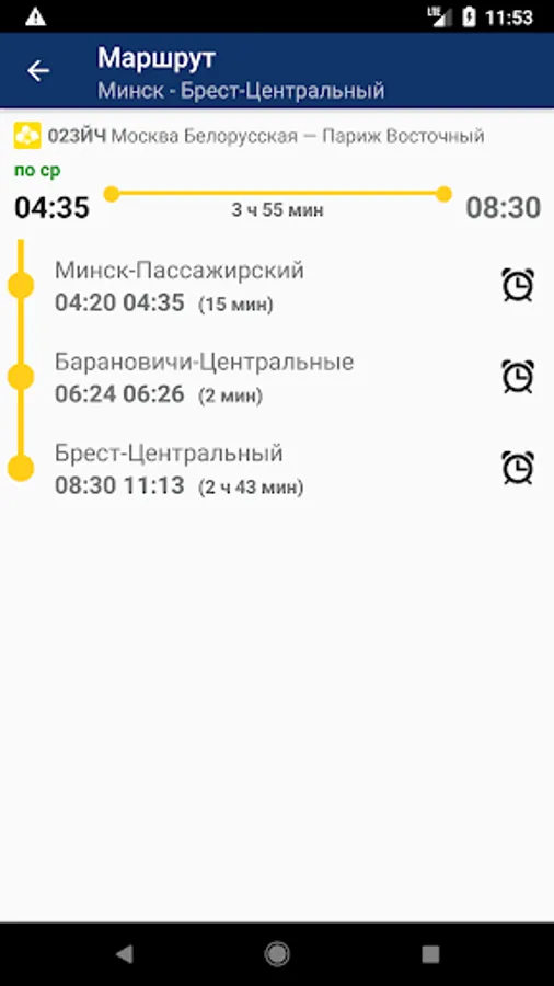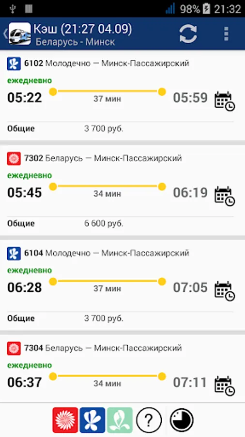 The program displays the schedule of trains between selected stations (or passing through selected station), shows the existence and value of w / tickets. Allows you to set reminders on the arrival / departure of trains.