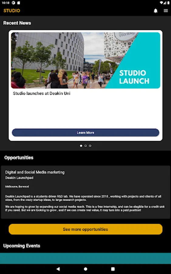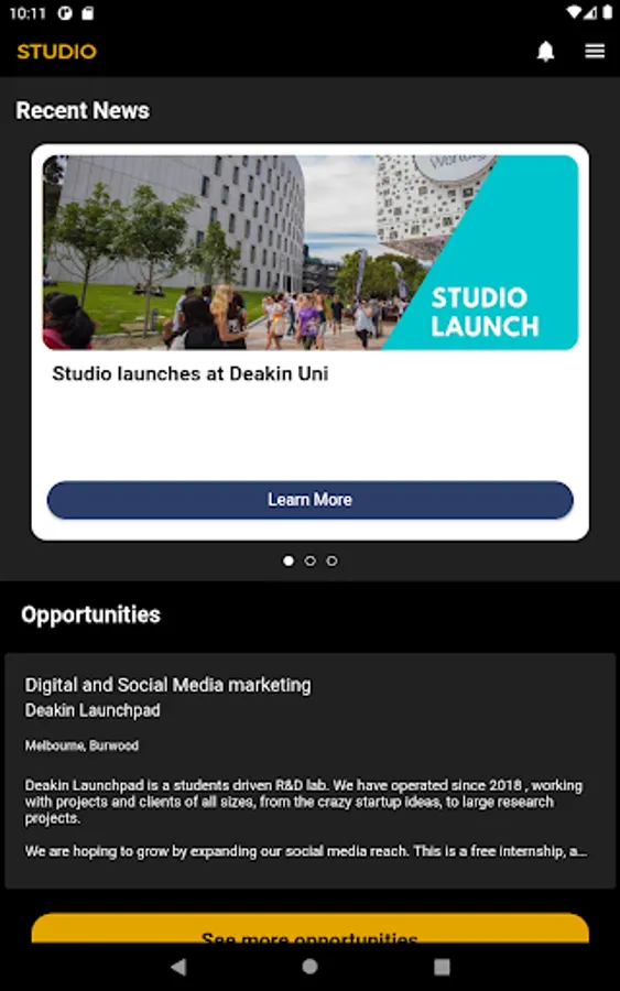 JOBS – Working opportunities from your university. Studio’s job opportunities are posted by the university for students to apply easily through the application. Those jobs could be internal (from recruiters within the university campuses) or external (from university’s partners outside the campuses). Nothing is better than job opportunities from your university posted to you through your mobile devices.