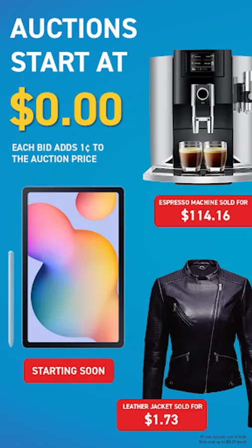 3. Start Bidding - All auctions start at $0.00. Each bid placed adds one penny to the final price of the item. Each bid restarts the timer to 10 seconds to allow a chance for someone else to place a bid. All items are guaranteed to sell! There are never reserve prices and the items can go for as low as 99% off.
