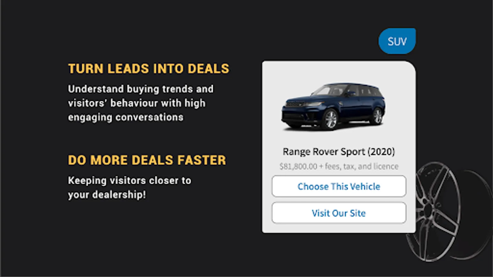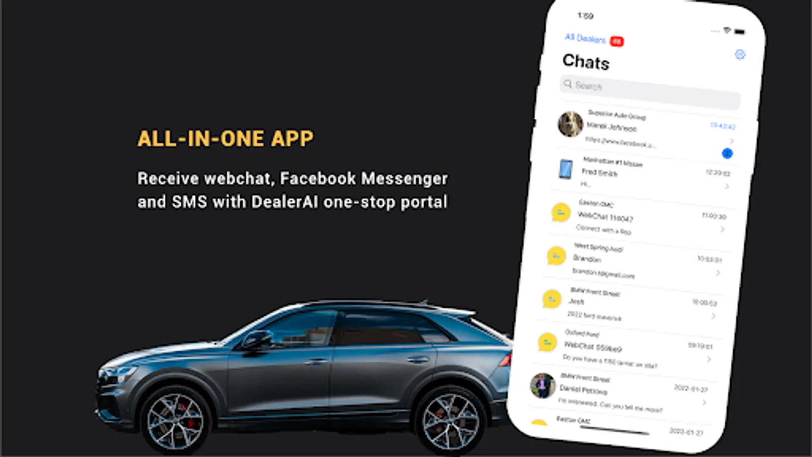 DealerAI is an intelligent and secure communication solution for car dealerships to provide online customer services through direct messaging. Dealerships can automate online vehicle inventory tracking, scheduling appointments, and responding to general inquiries. In addition, the DealerAI app allows the sales team to keep engaging with quality leads anytime, anywhere!