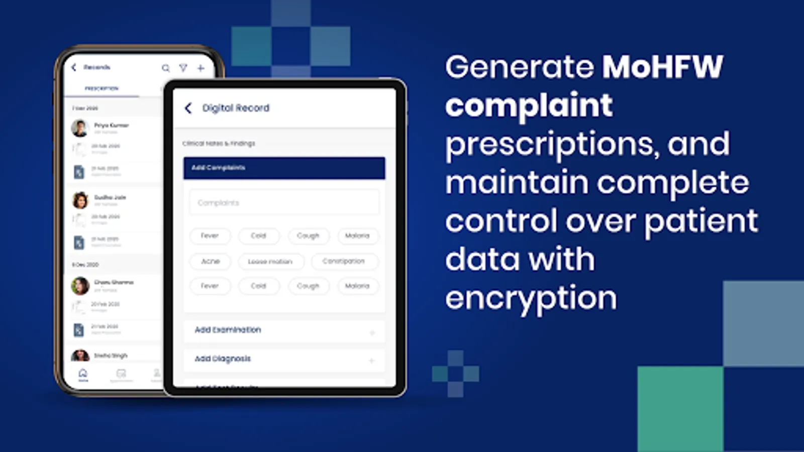With DearDoc’s record management system, you can store all necessary prescriptions, lab reports, and other records for your patient in a simple, easy to search, and easy to track place. In addition, use our digital prescription writing tool to create MoHFW complaint prescriptions.