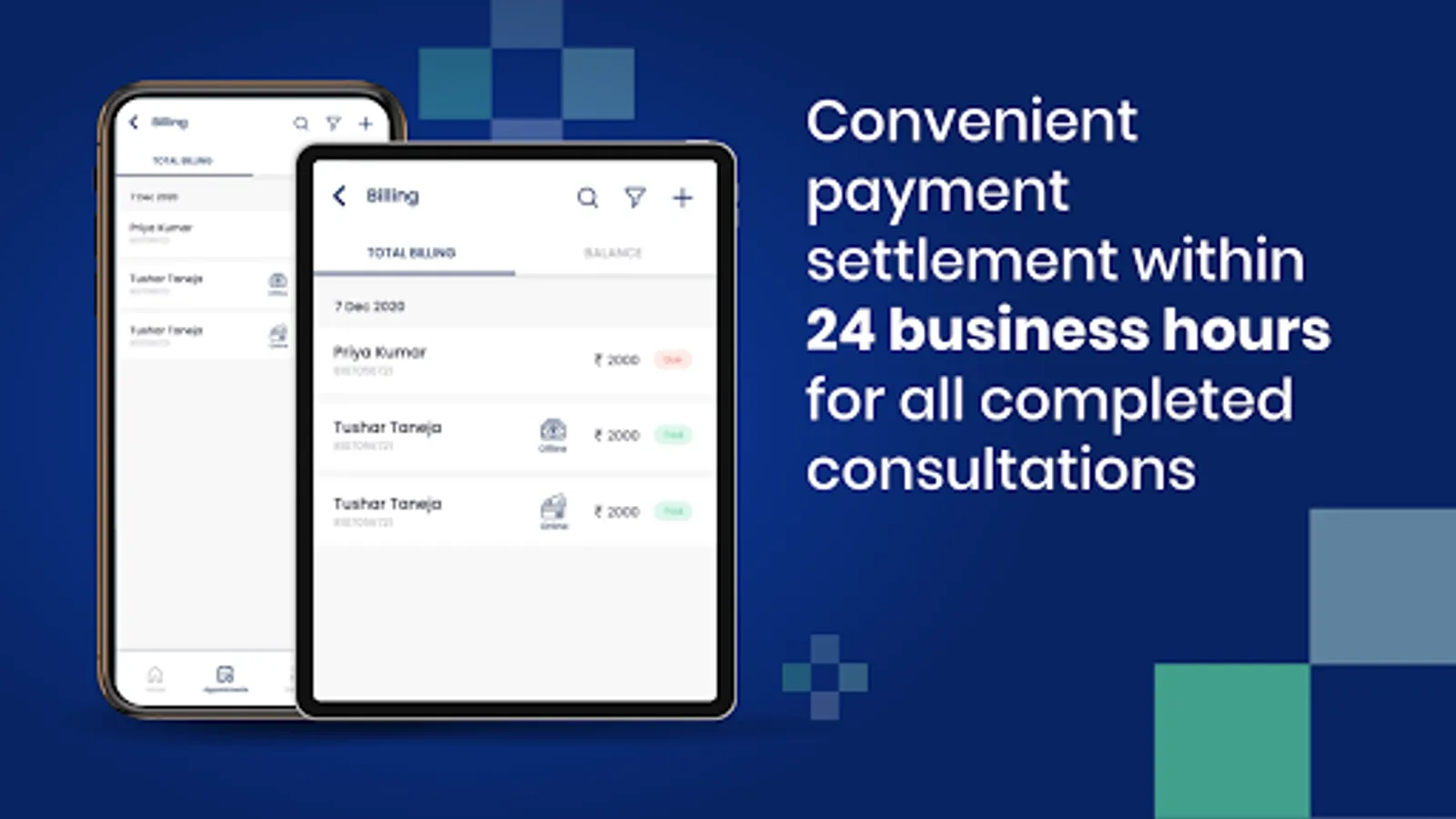 DearDoc settles payments for all completed consultations within 24 business hours of completion. It generates and shared invoices for consultations with ease and also allows you to manage all your billing and payments from a single platform.