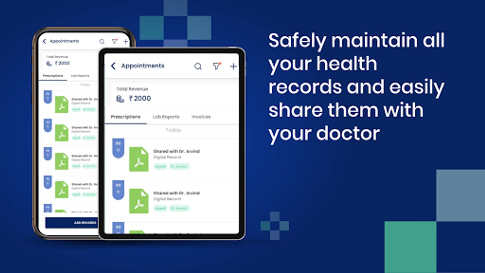 With DearDoc’s digital record management system, you can store all your prescriptions, lab reports, and other records in a safe and easy to search place so that you can easily share those with your doctors and will never have to worry about losing them.