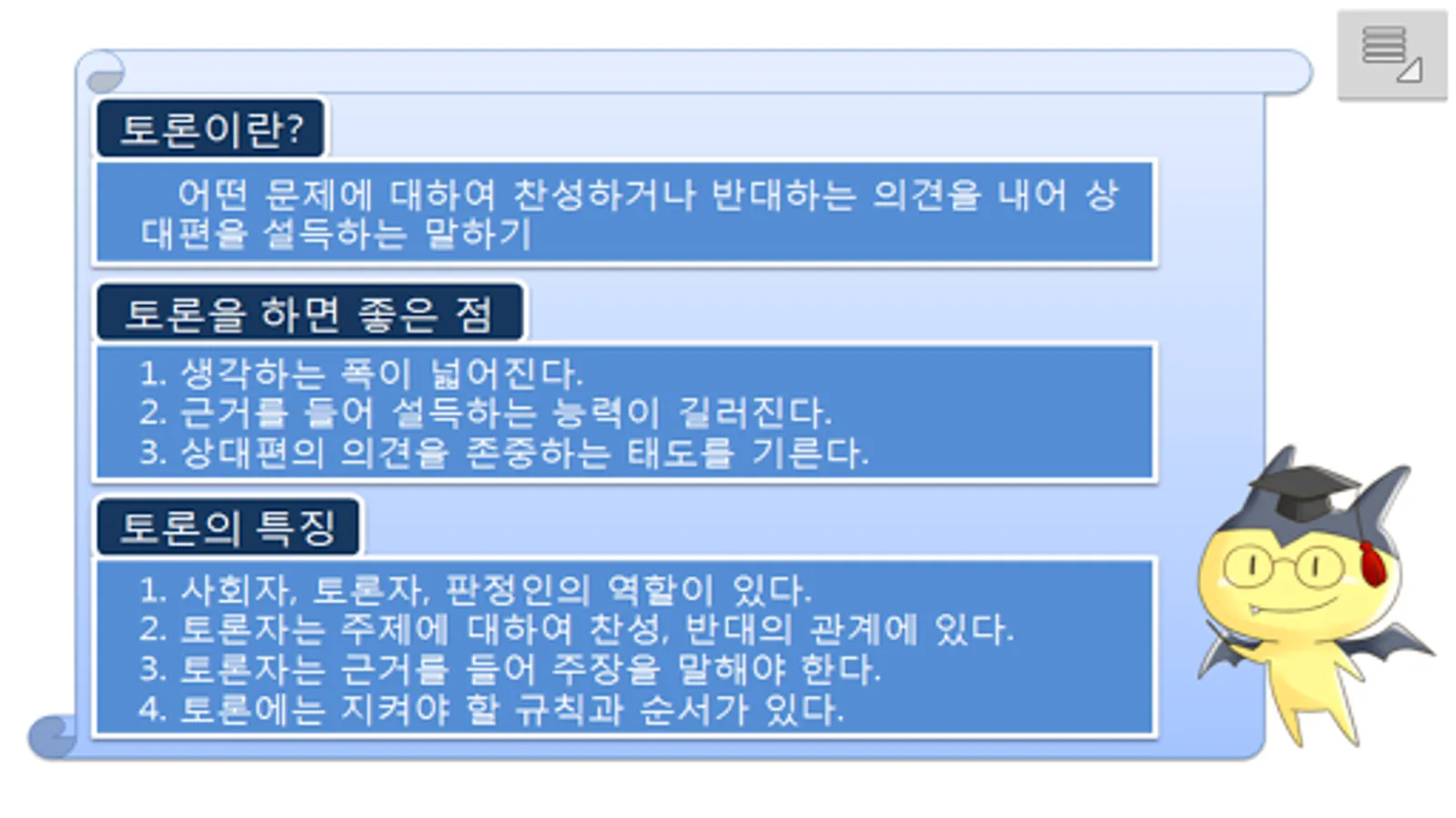 4. 요점 정리: 토론 열기에서 공부한 내용을 한눈에 보도록 요약해두었습니다.