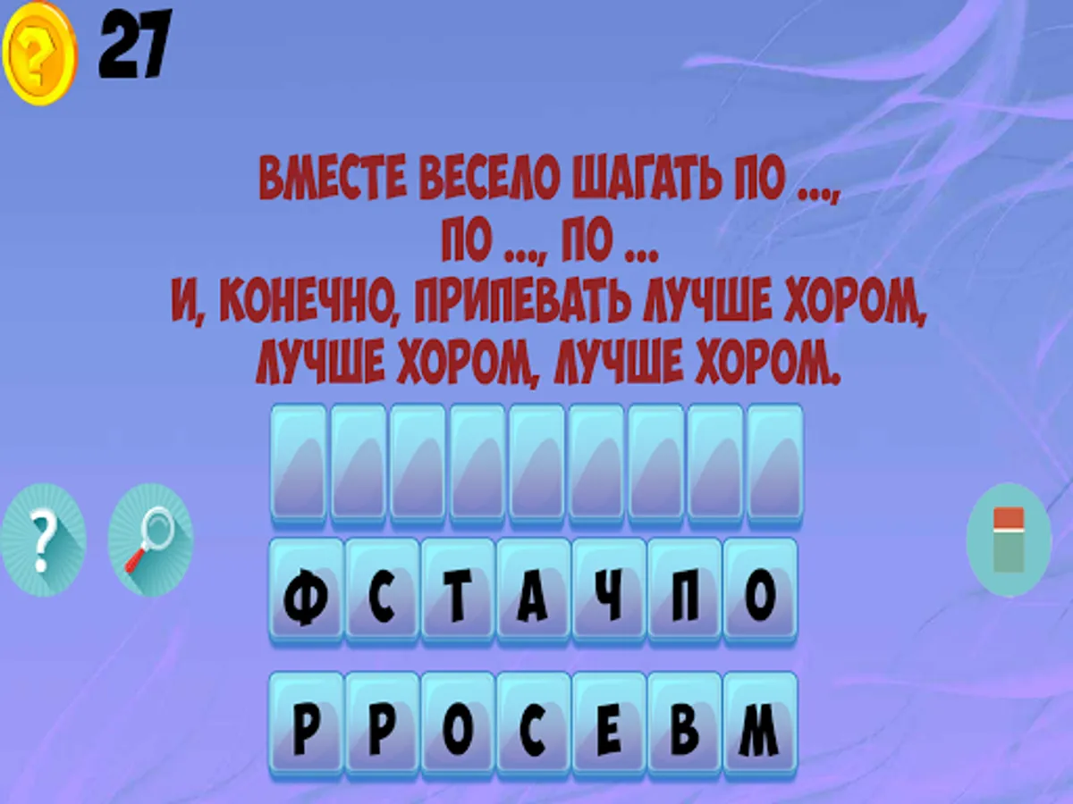 In the game you have to finish a song to remember or guess the missing word in the song. Simply register to spell the missing phrase and song will be complete. The game has hundreds of songs on different themes: children's, military, about love, popular.