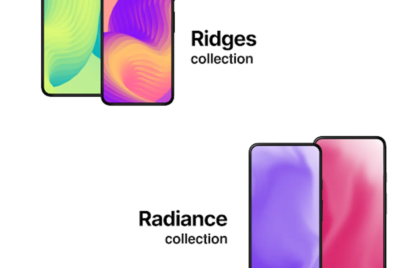 Some of the collections include Landscapes, Iridescence, Neon, Blob Gradients, Swirls, Material You, Curves, Wireframes, Radiance, Mesh Gradients, Ridges and many more.