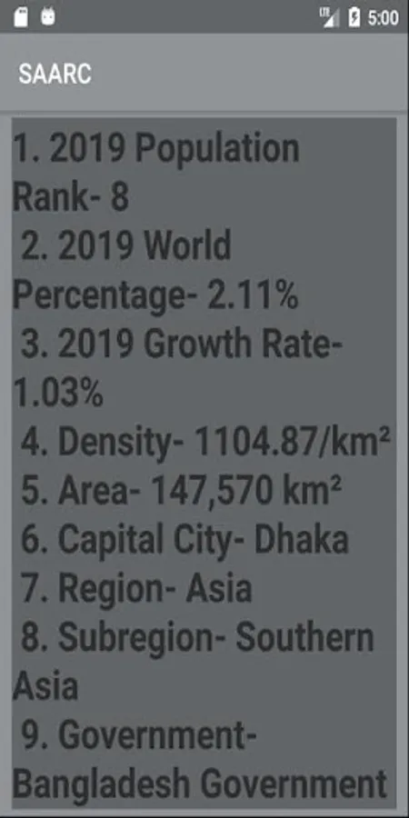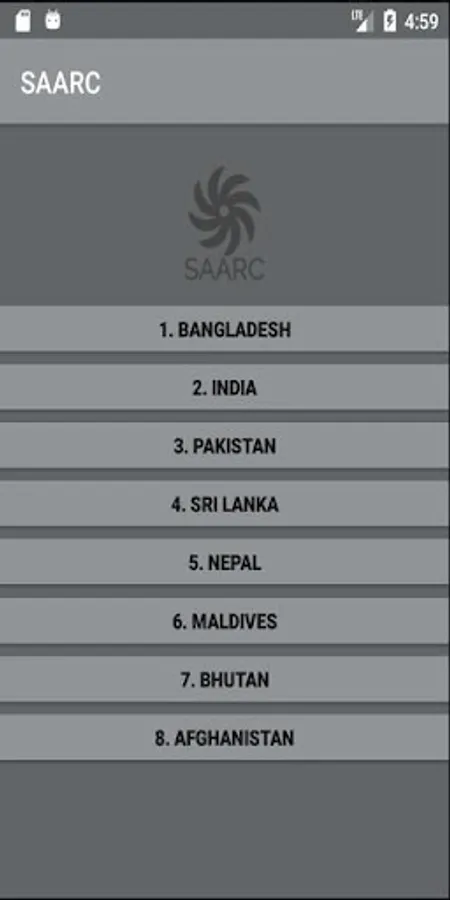 SAARC is stand for South Asian Association for Regional Cooperation. Its an organization consisting of eight asian countries. From this app learner comes to know about countries population rank, density, area, government etc.