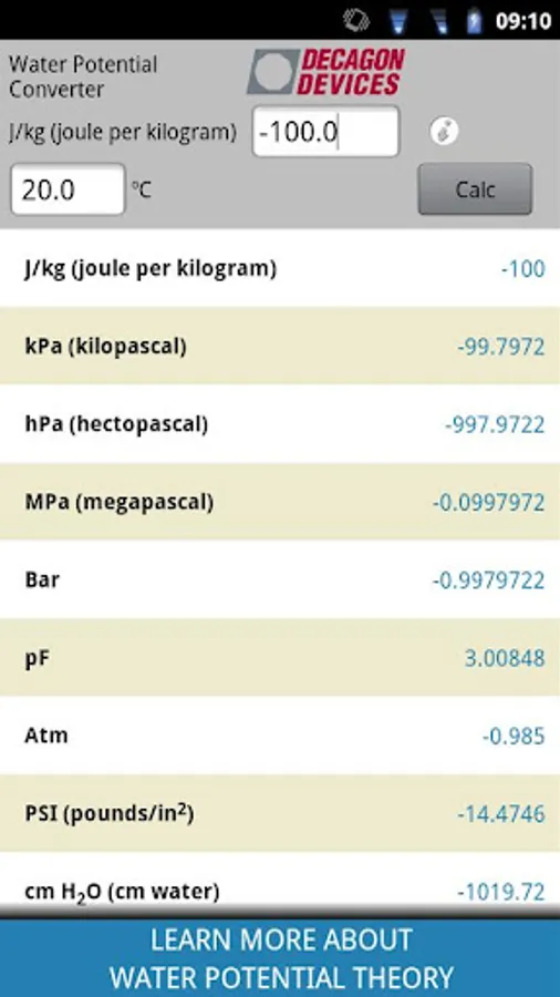 There are many different units used for soil water potential (also known as soil suction, or soil tension). Some use kilopascals, other use bars, still others use pF. This app will allow you to easily convert from one unit of water potential to another, at any given temperature.