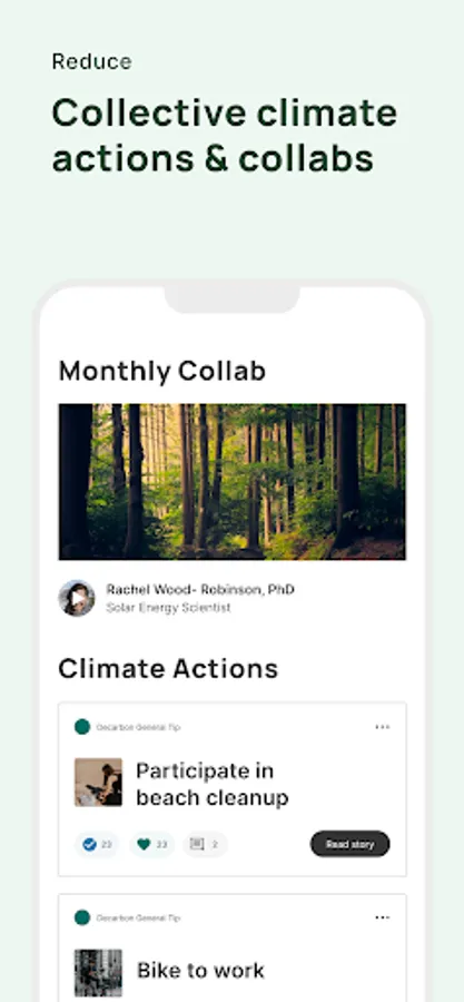 Decarbon collabs bring everyone in the app together to work towards the same climate action goal. These collabs are hosted by a different leader in the climate movement. Collabs are a great way to learn and hear how these experts became more involved in their particular area of focus.