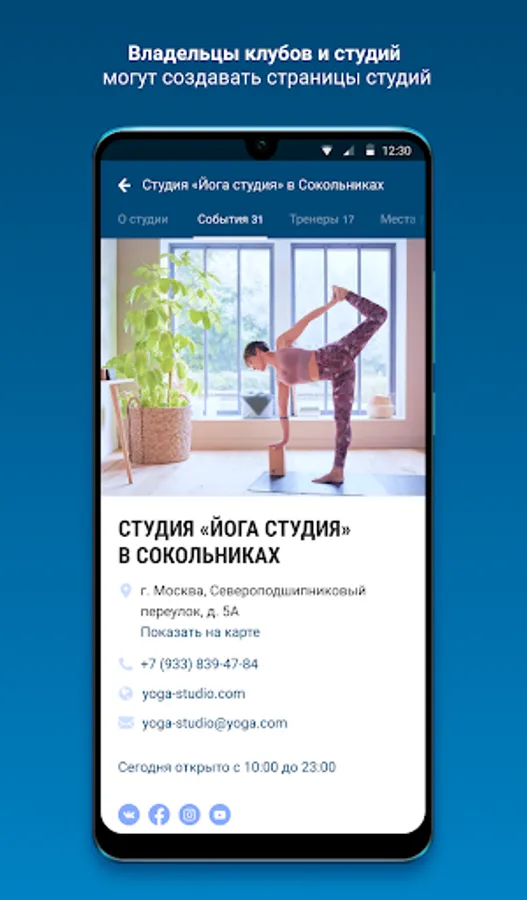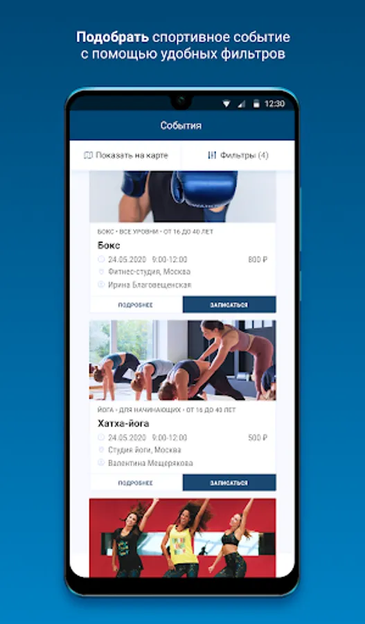 Start a healthy lifestyle and exercise with All Do Sport! Our application is what you need to quickly find interesting activities. Every day, you can practice different sports until you find one that you like. Choose a lesson near your home, work or in an unusual place, read more about the lesson, trainer and studio and sign up for it through All Do Sport. Add your workout to your calendar and come to the gym