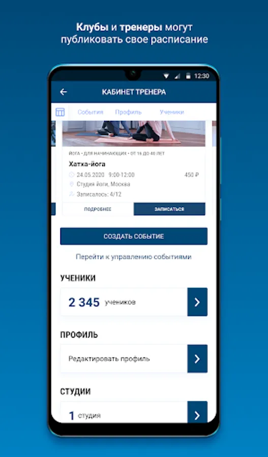 To organize classes and sporting events, we offer automated tools. All Do Sport allows you to keep a schedule, collect student information and store attendance statistics. Download the application, fill out the profile of the trainer and studio and add a schedule. Students will see your classes and be able to sign up.