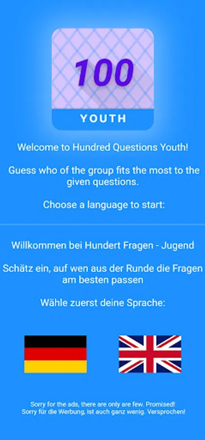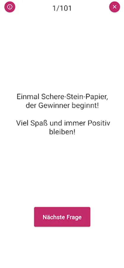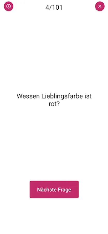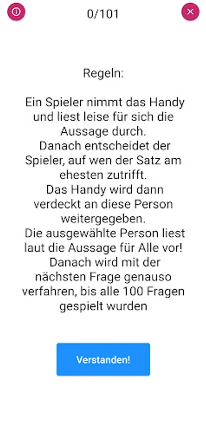 There are 100 questions. One person reads through the question for him/herself and decides to whom in the group this question best applies. The cell phone is then passed to this person face down and the question is read aloud by him or her. The game is then repeated with the next question. Available in German and English. Can be used to playfully learn the basics of German.