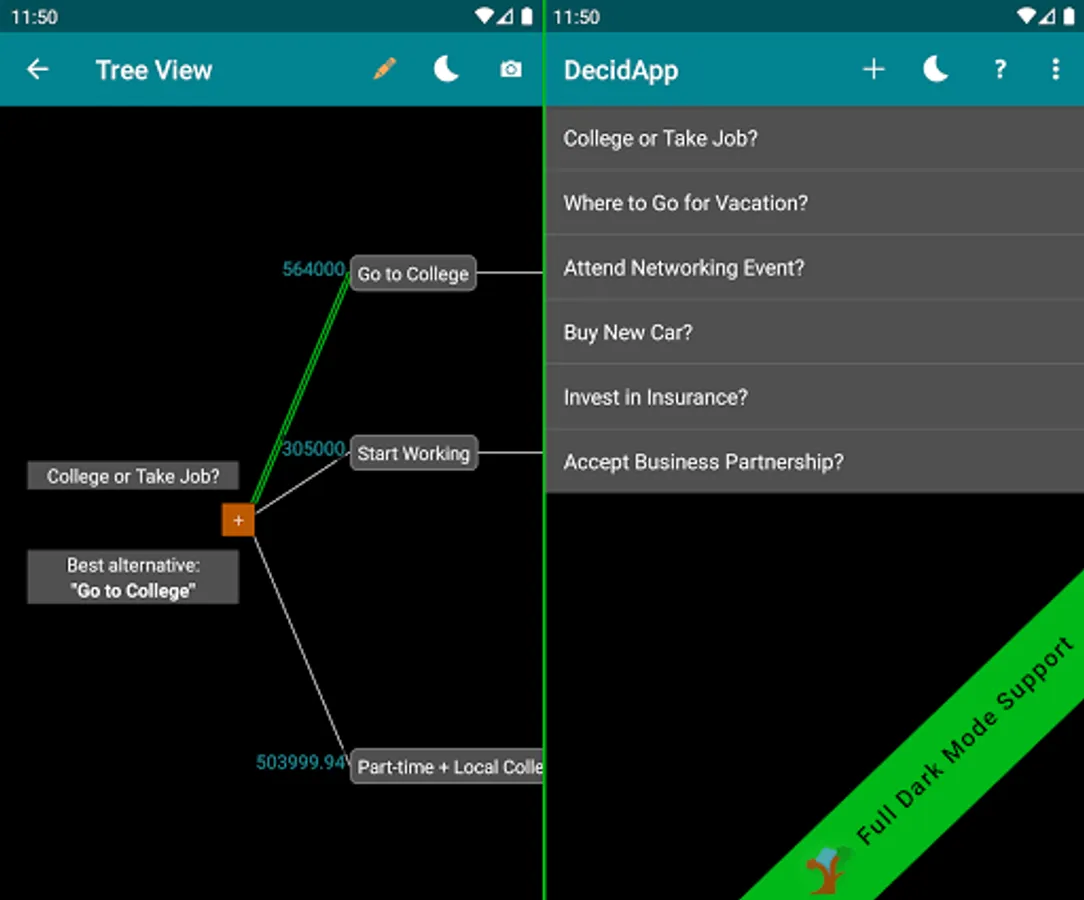 Unlimited Decisions, Complete Help, Sharing – Store unlimited decisions. Access a comprehensive help section to learn about decision making and utilising decision trees. Share decisions seamlessly through export/import and image snapshots.