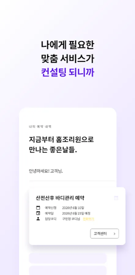 You can apply for essential services such as postpartum care, body care, nursing care, healthy meals, home clinics, and Pilates, which you can receive only when you go to an advanced postpartum care center. We provide home service at 1:1 by visiting verified experts. It is more comfortable and reliable because it protects the privacy and all data is managed in a safe manner.