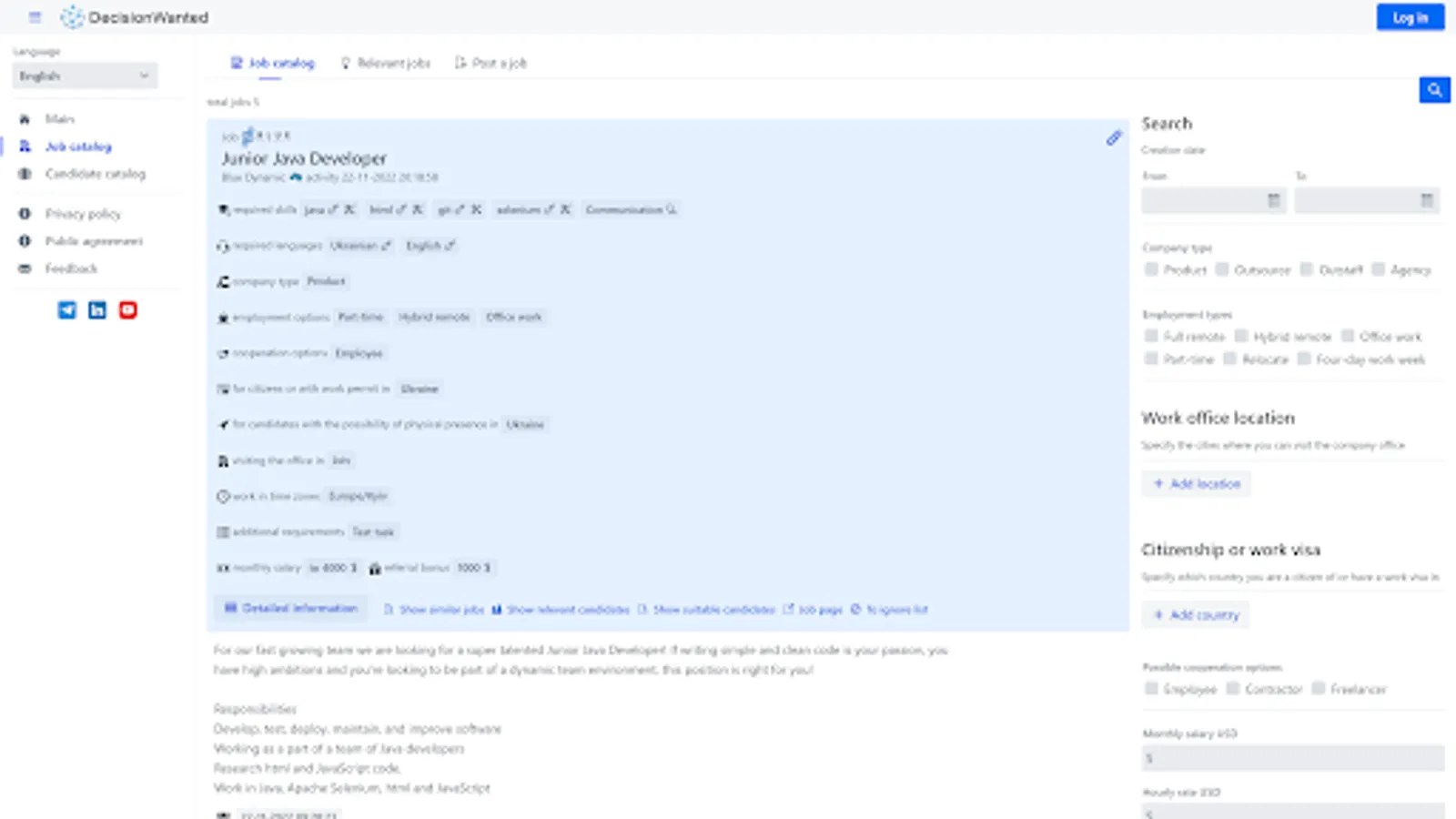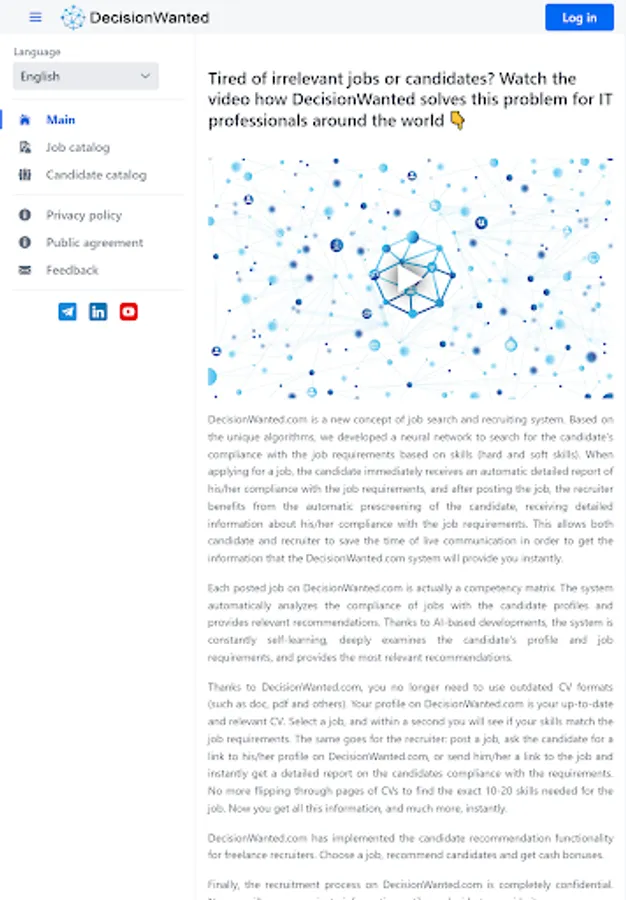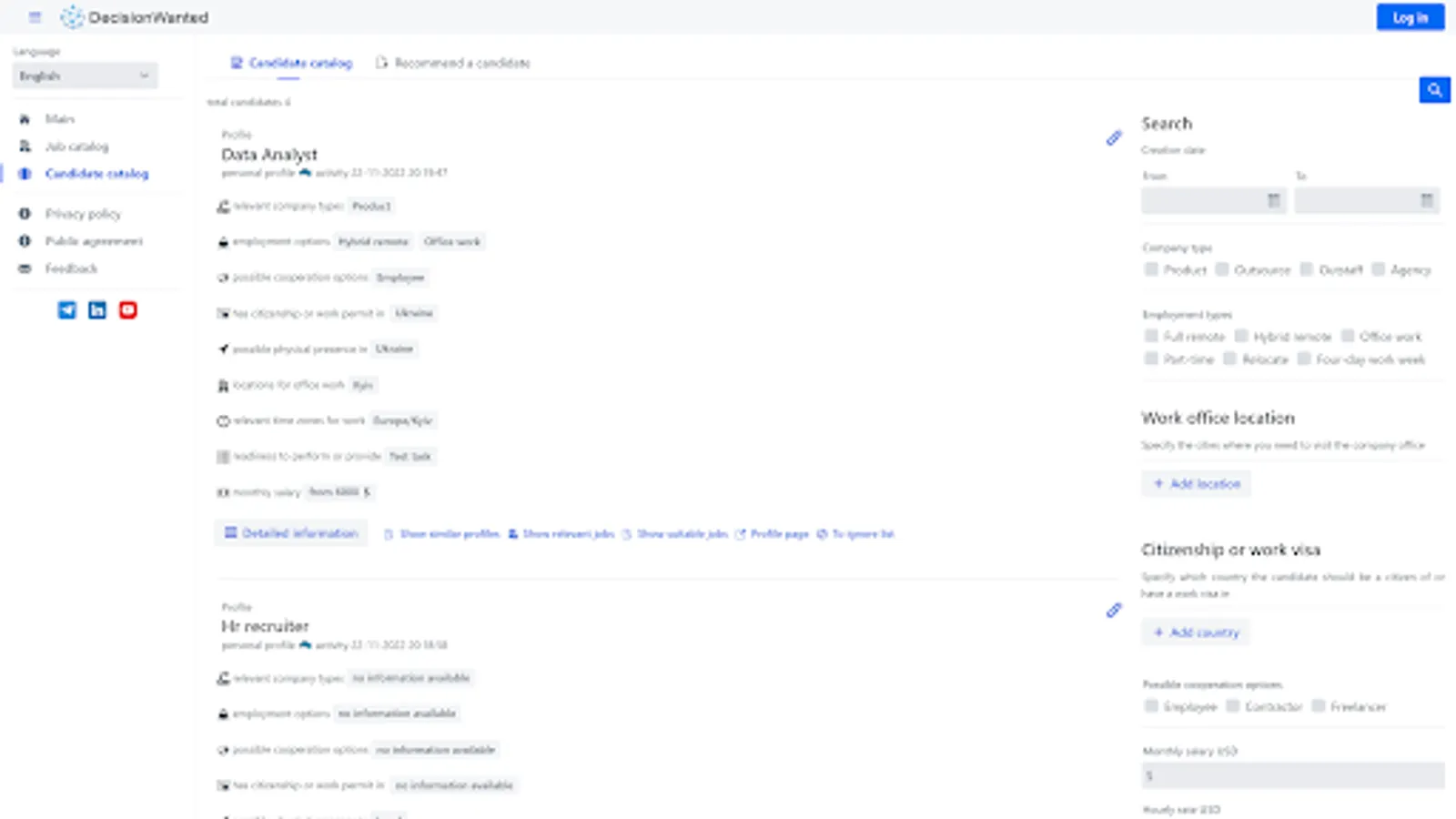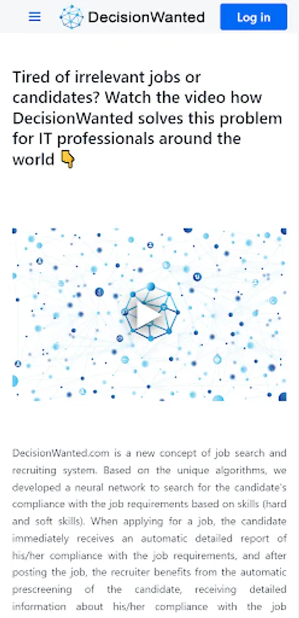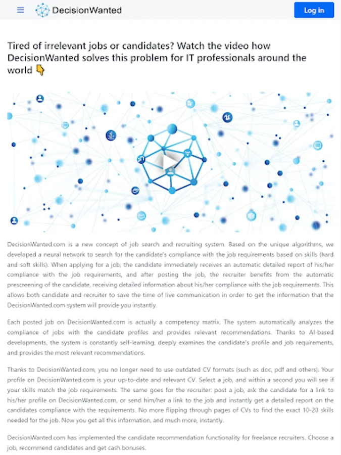 DecisionWanted.com is a new concept of job search and recruiting system. Based on the unique algorithms, we developed a neural network to search for the candidate's compliance with the job requirements based on skills (hard and soft skills). When applying for a job, the candidate immediately receives an automatic detailed report of his/her compliance with the job requirements, and after posting the job, the recruiter benefits from the automatic prescreening of the candidate, receiving detailed information about his/her compliance with the job requirements. This allows both candidate and recruiter to save the time of live communication in order to get the information that the DecisionWanted.com system will provide you instantly.