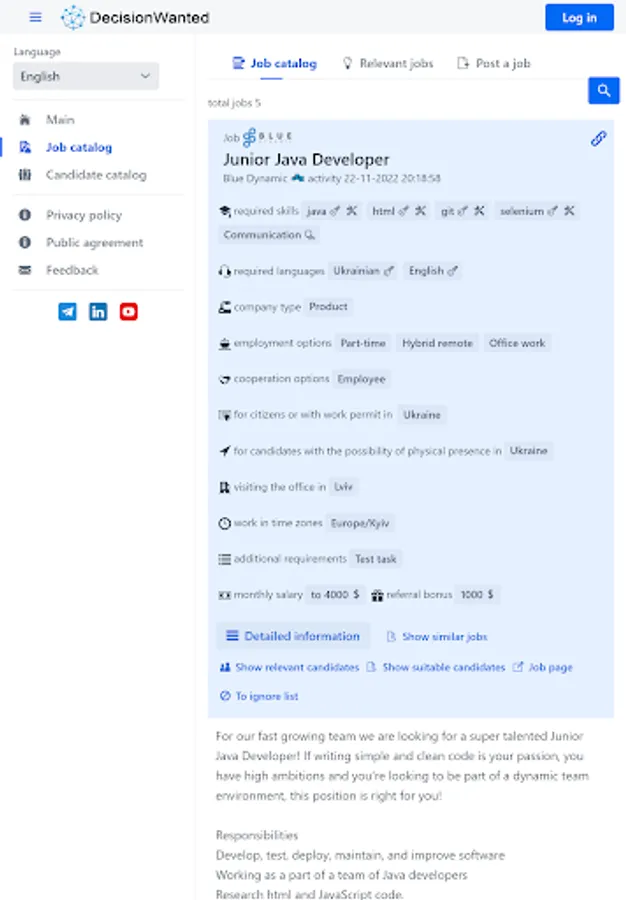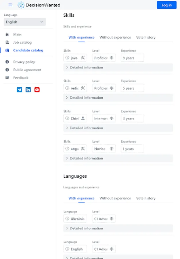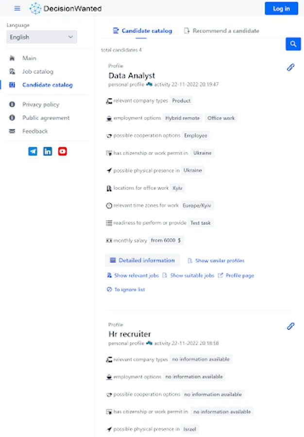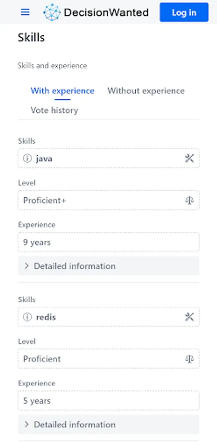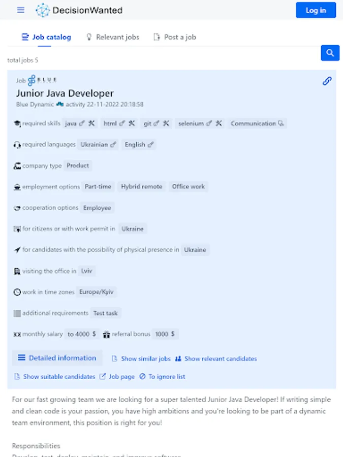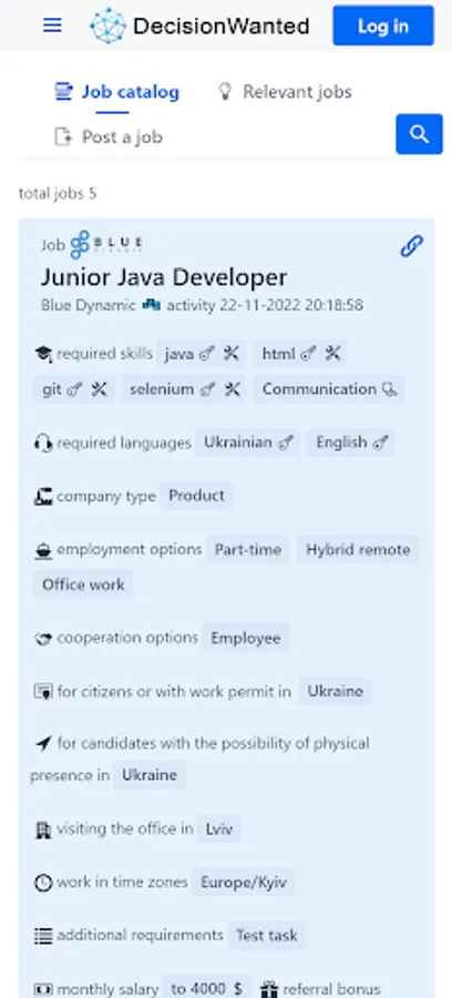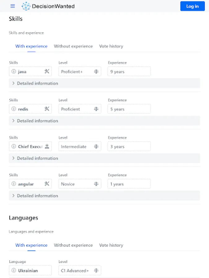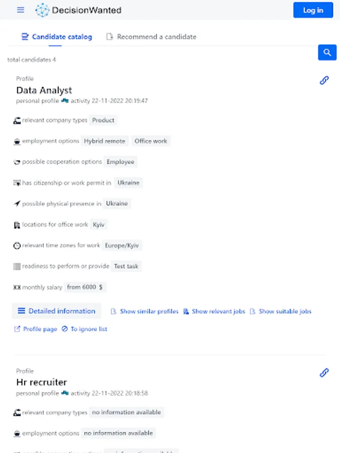 DecisionWanted.com is a new concept of job search and recruiting system. Based on the unique algorithms, we developed a neural network to search for the candidate's compliance with the job requirements based on skills (hard and soft skills). When applying for a job, the candidate immediately receives an automatic detailed report of his/her compliance with the job requirements, and after posting the job, the recruiter benefits from the automatic prescreening of the candidate, receiving detailed information about his/her compliance with the job requirements. This allows both candidate and recruiter to save the time of live communication in order to get the information that the DecisionWanted.com system will provide you instantly.