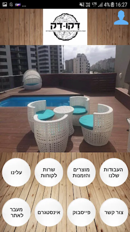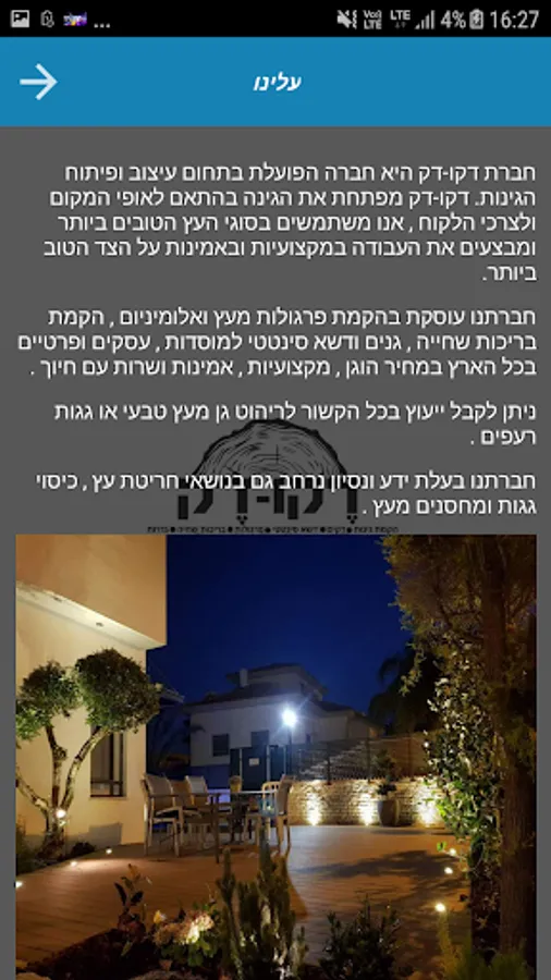 חברת דקו-דק היא חברה הפועלת בתחום עיצוב ופיתוח הגינות. דקו דק מפתחת את הגינה בהתאם לאופי המקום ולצרכי הלקוח .אנו משתמשים בסוגי העץ הטובים ביותר , כמו כן חברתנו עוסקת בהקמת פרגולות מעץ ואלומיניום , הקמת בריכות שחייה , גנים ודשא סינטטי , עבודות עץ ודק . ניתן להתרשם מקטלוג עבודות באפליקציה .