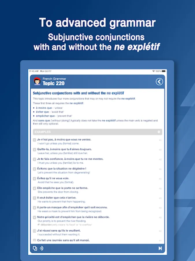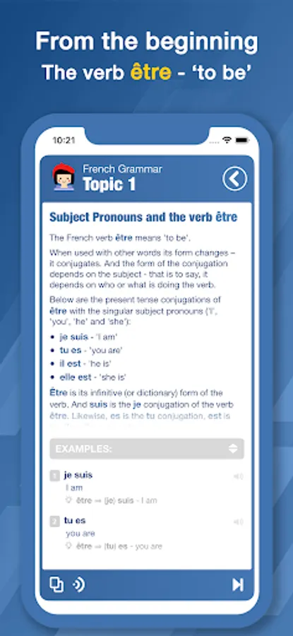 Each topic includes a thorough explanation of the grammar and then lots of examples that illustrate the grammar. Each example includes an English translation, as well as notes highlighting how each example illustrates that topic's grammar, as well as the meanings of new French words.