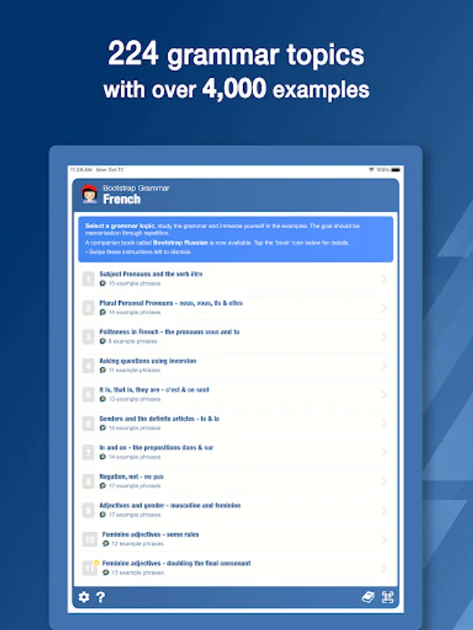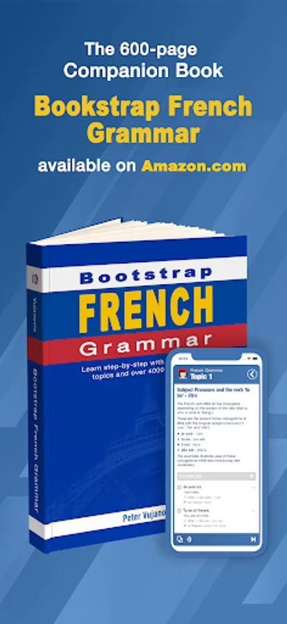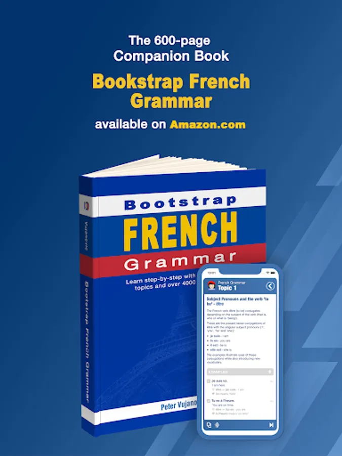 A companion BOOK is now available called "Bootstrap French Grammar". The book contains all the content contained in this book - including 224 grammar topics and over 4,000 example phrases.