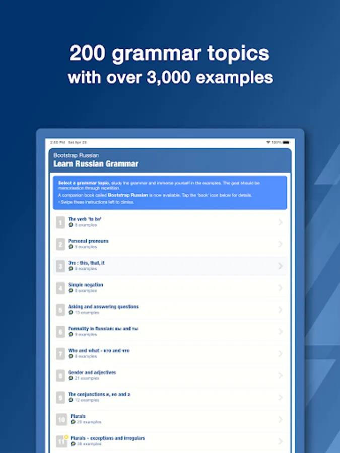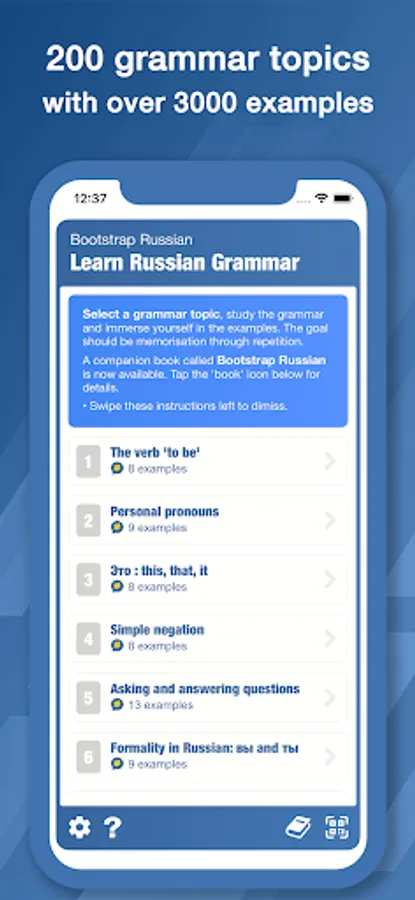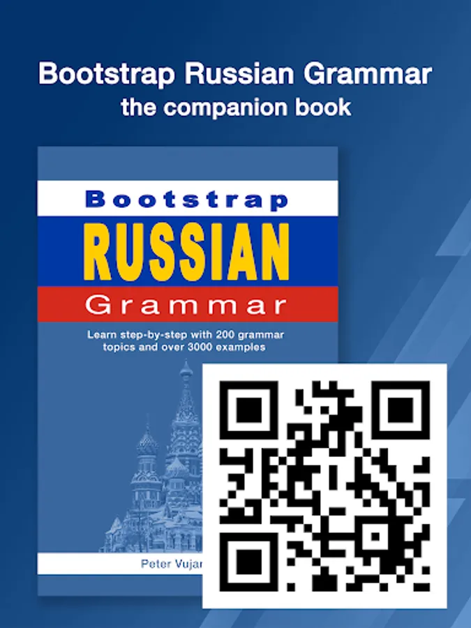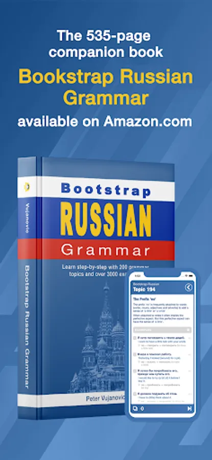 A companion BOOK is now available called "BootStrap Russian Grammar". The book contains all the content contained in this book - including 200 grammar topics and over 3000 example phrases.
