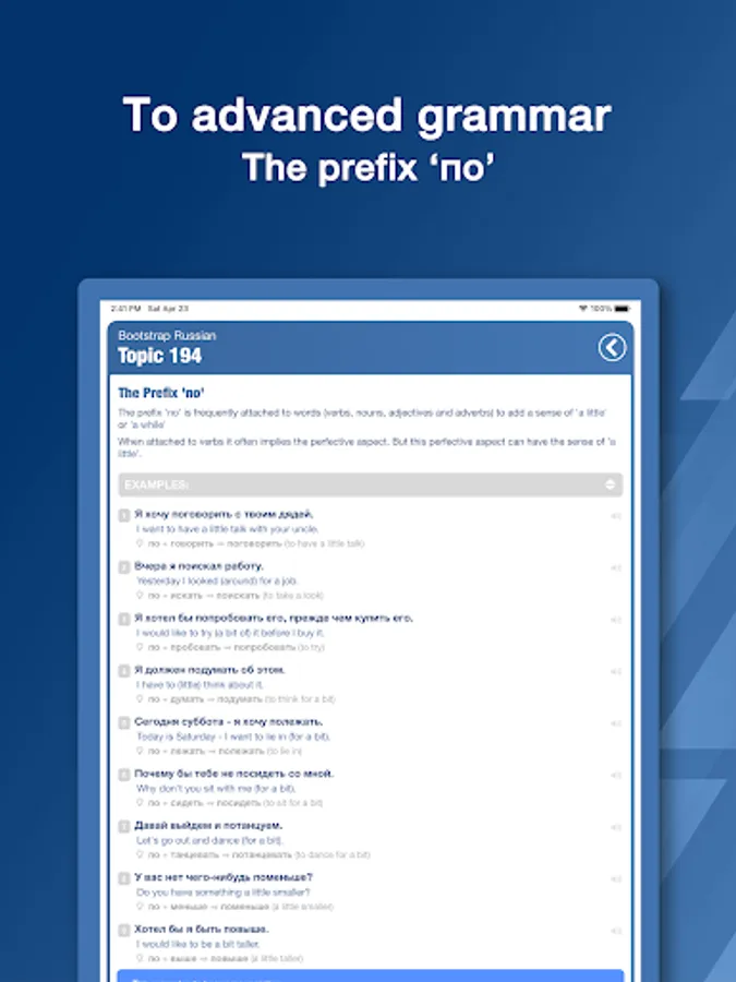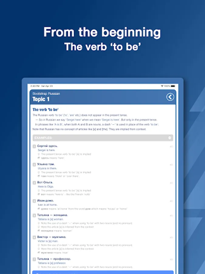 Each topic includes a thorough explanation of the grammar and then lots of examples that illustrate the grammar. Each example includes an English translation, as well as notes highlighting how each example illustrates that topic's grammar, as well as the meanings of new Russian words.