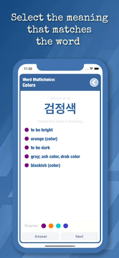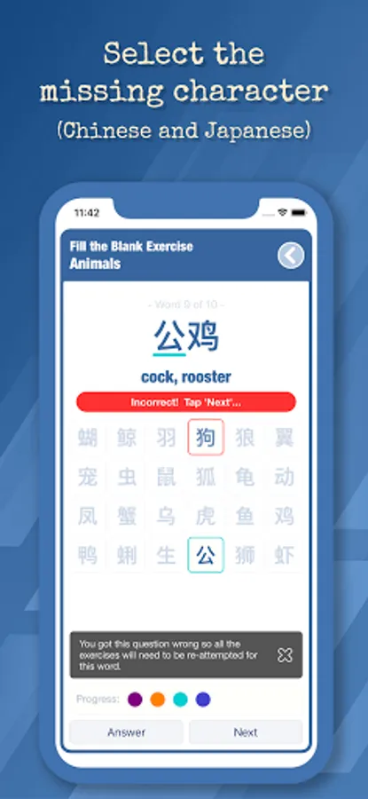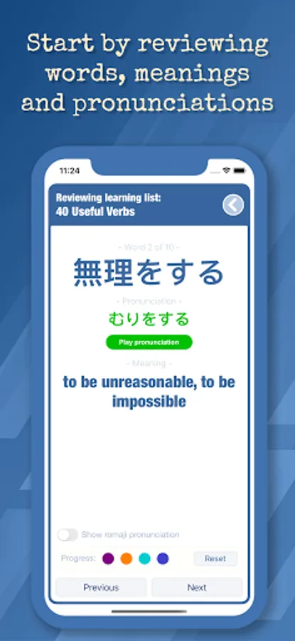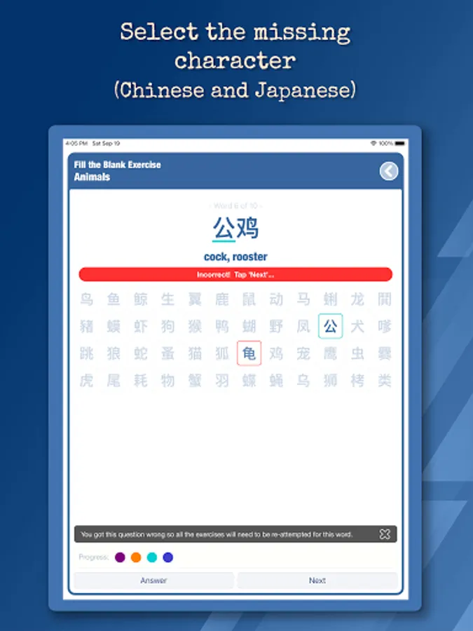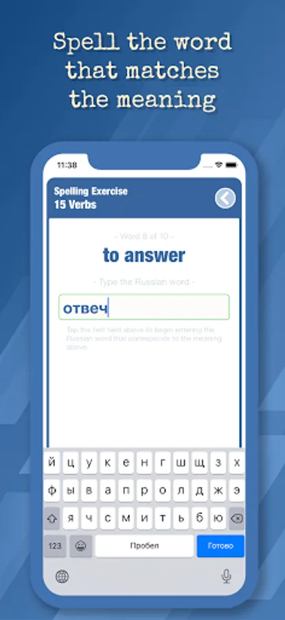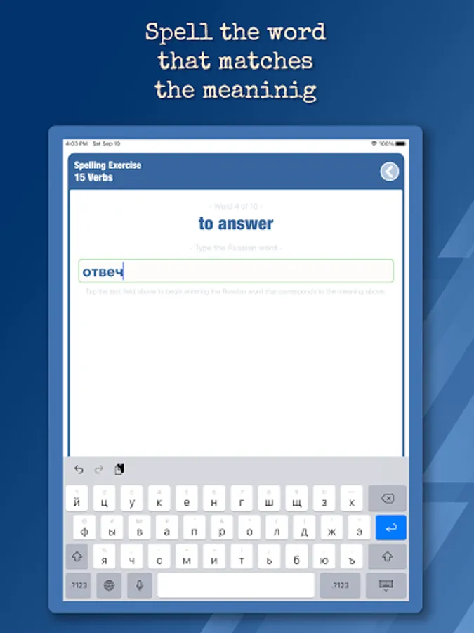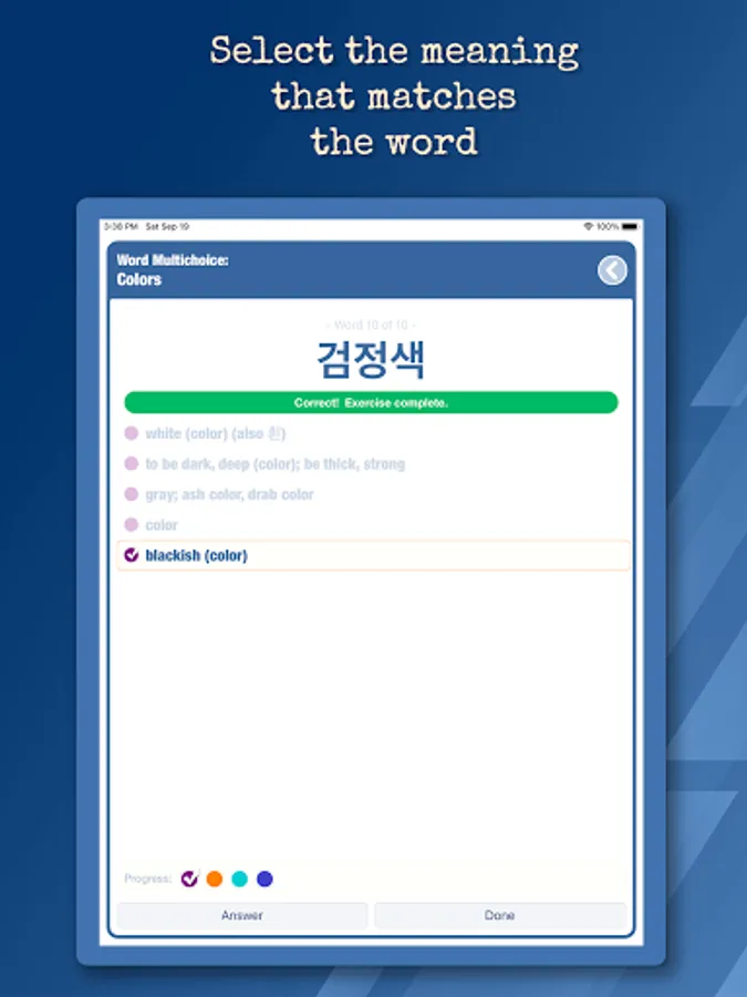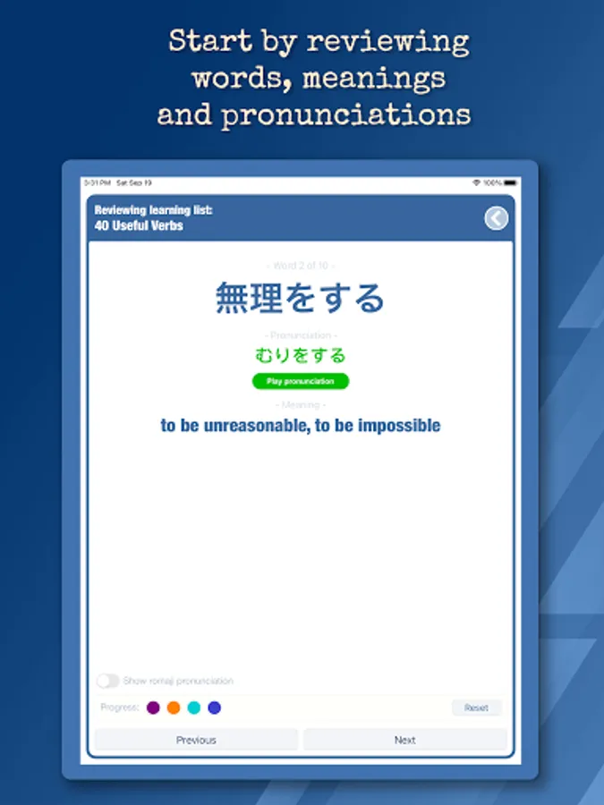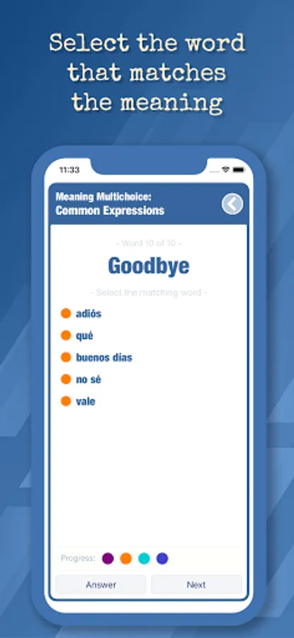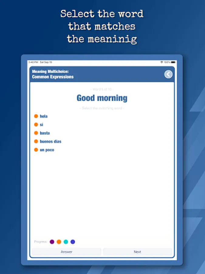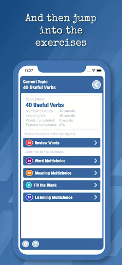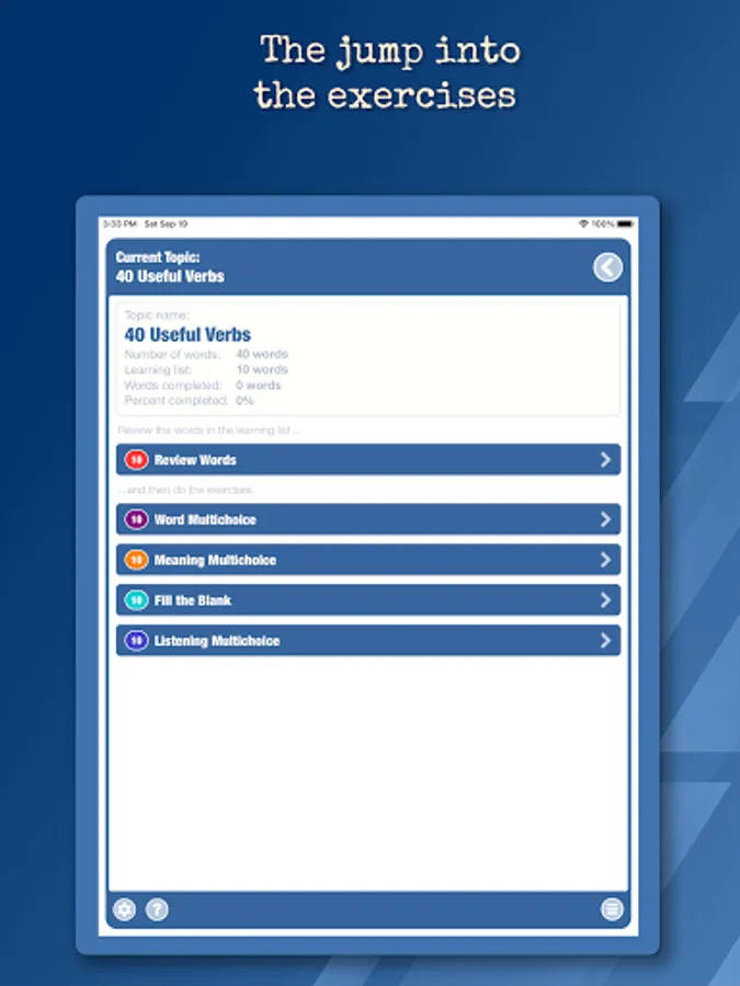 Start by reviewing the words in groups of ten (the learning list). Then jump into the exercises - multiple choice, spelling and listening. Get one answer wrong and you have to redo all the exercises for that word - reinforcing the words that words that need most attention.