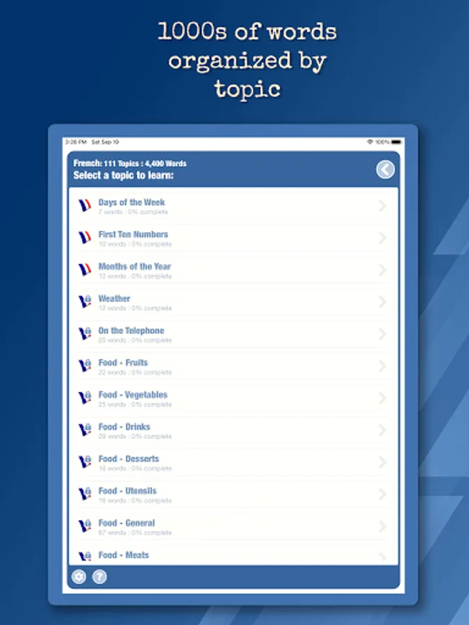 Each language includes 1000s of words organised by topic, And each and every word with native speaker audio.