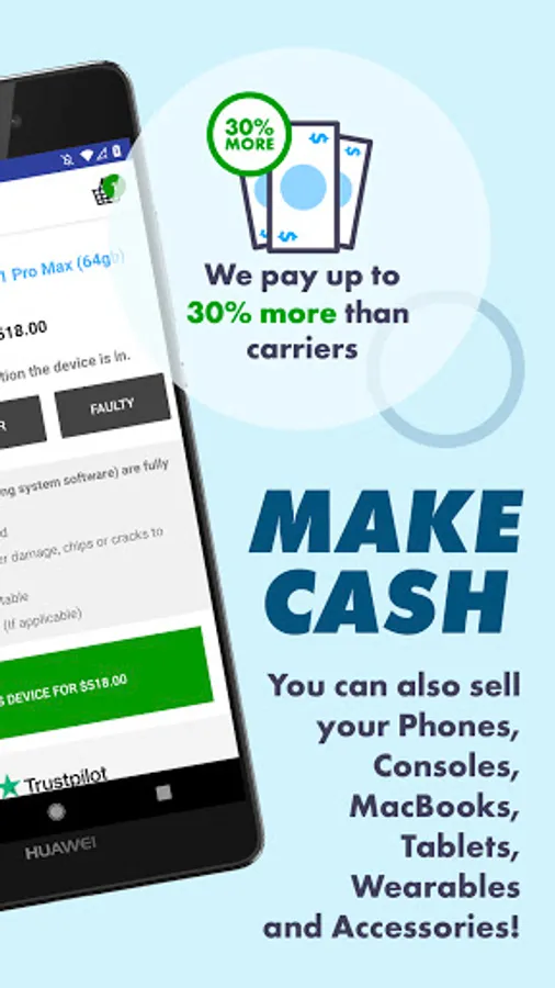 You can use our app to sell Cell Phones, iPads, MacBooks, Tablets, Consoles, Wearables, CDs, DVDs, Blu-rays, Video Games and Books for cash. By recycling your old stuff, you prevent these items from entering landfill too!